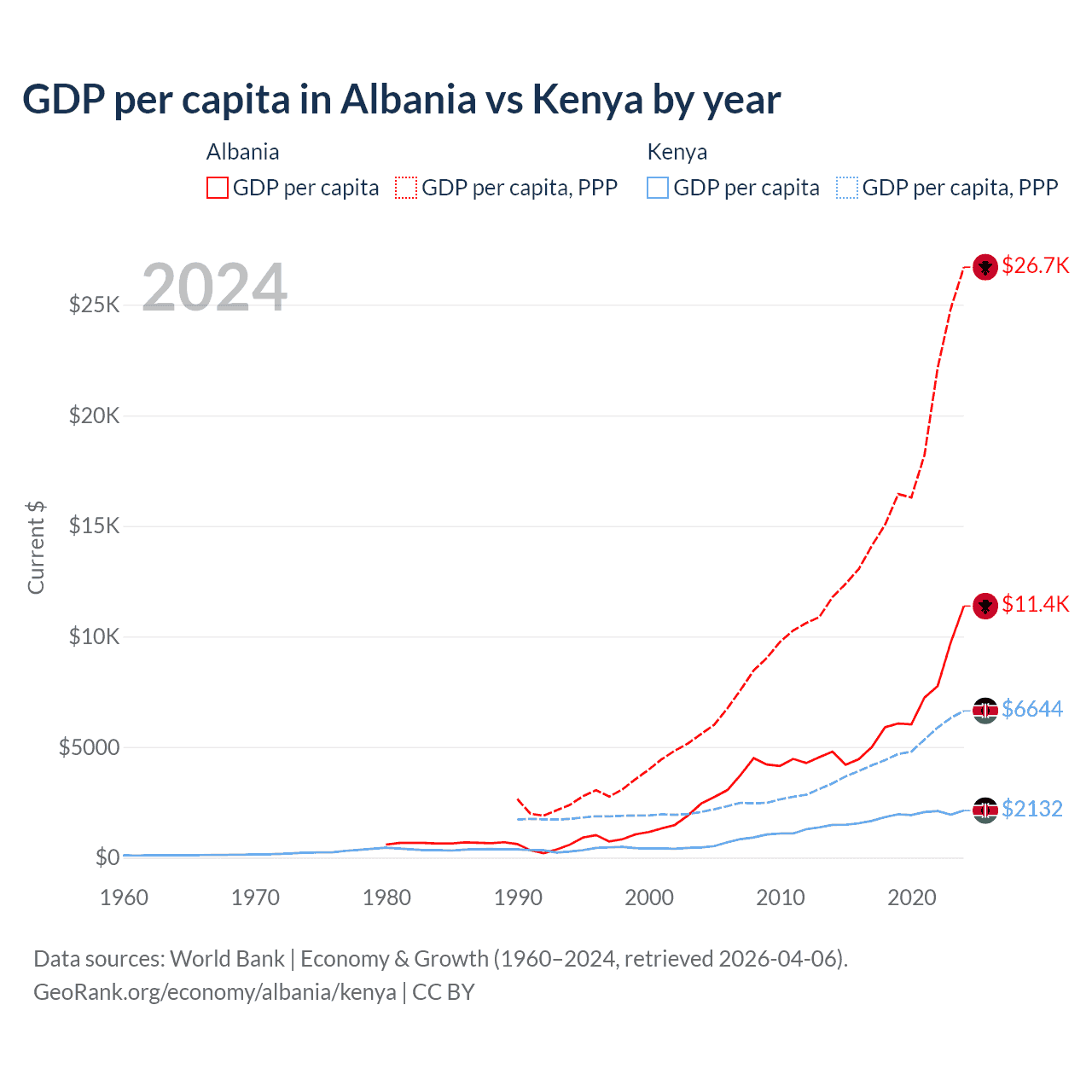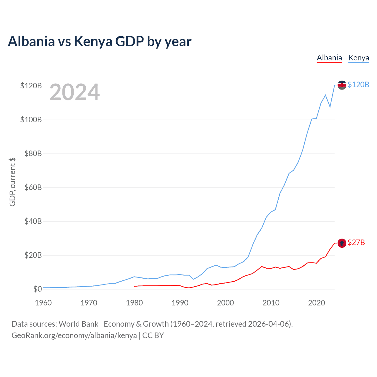 Albania has a GDP of $27B compared to $120B for Kenya, ranking 112/197 and 64/197 by economy size, respectively.
