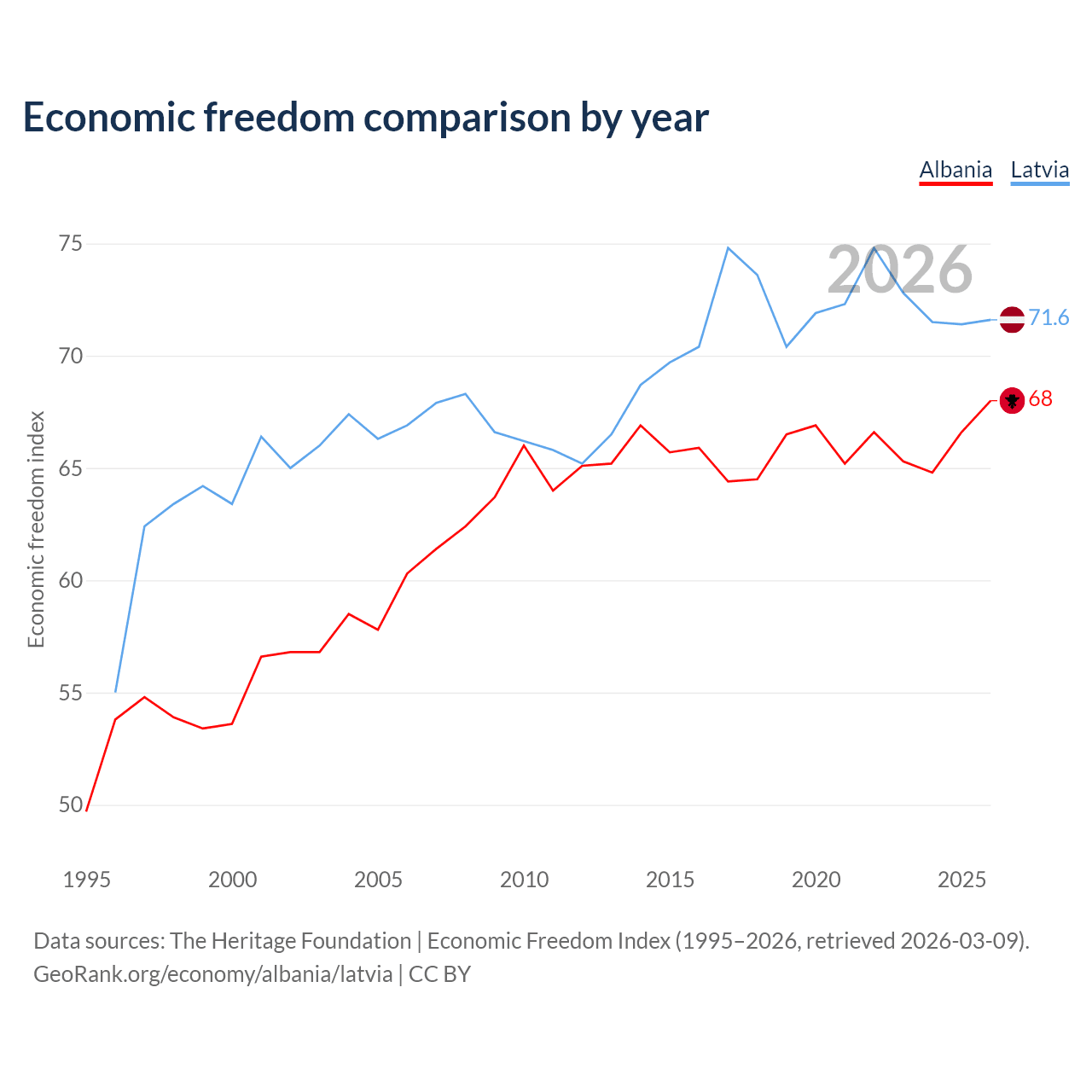 The Economic Freedom Index for Albania is 68, ranking 50/197, compared to 71.6 for Latvia, ranking 31/197. The chart above displays a comparison of annual changes in economic freedom indexes.