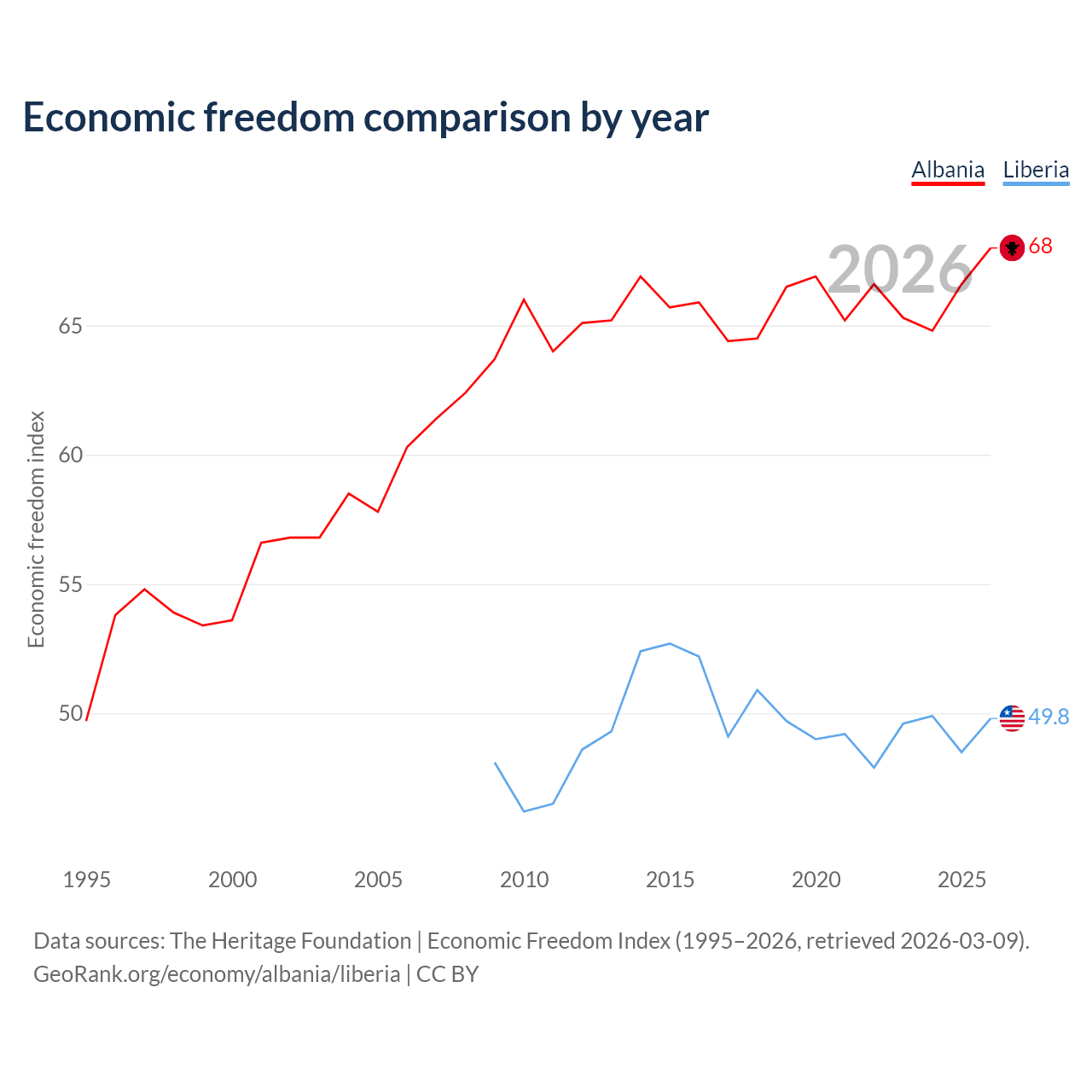 The Economic Freedom Index for Albania is 68, ranking 50/197, compared to 49.8 for Liberia, ranking 163/197. The chart above displays a comparison of annual changes in economic freedom indexes.