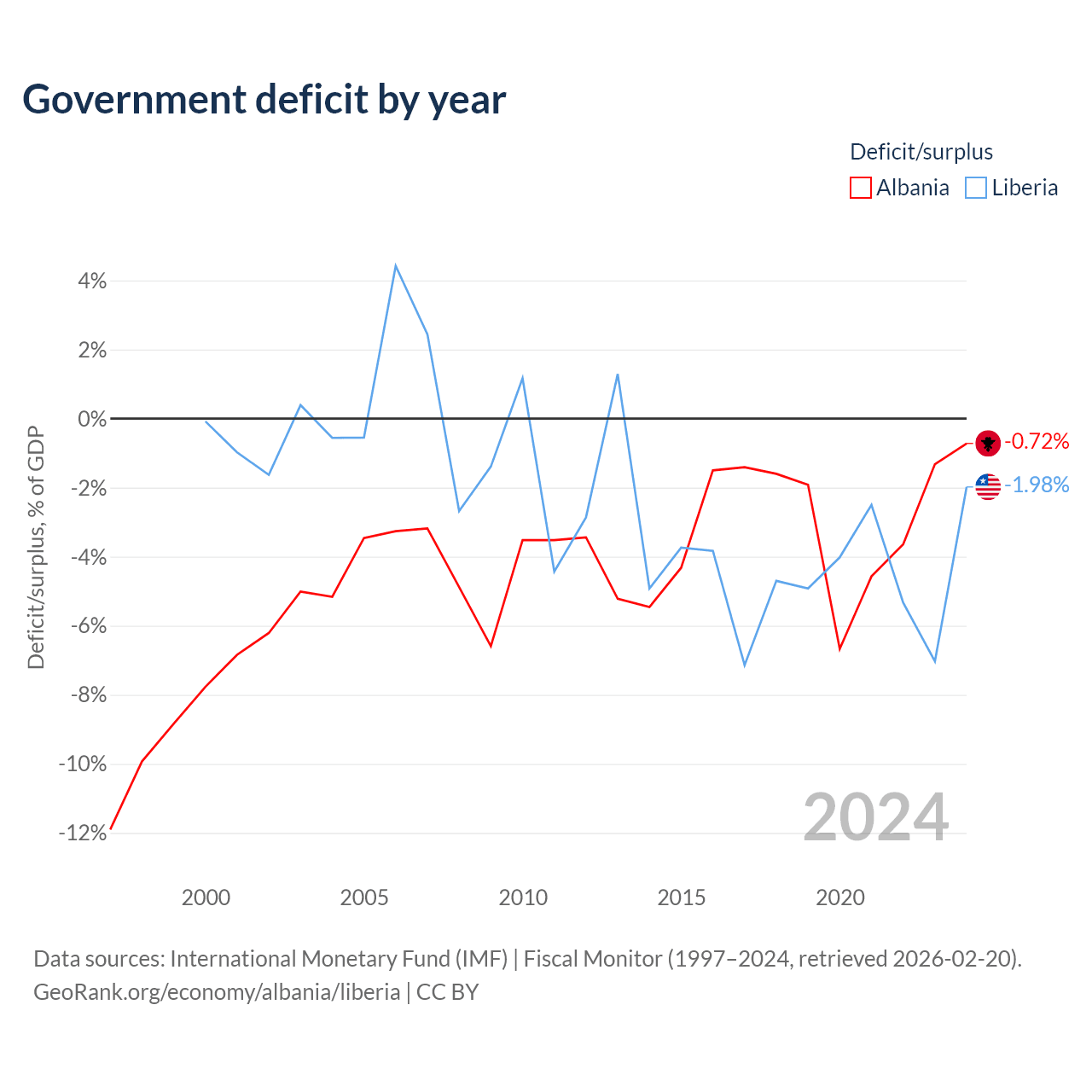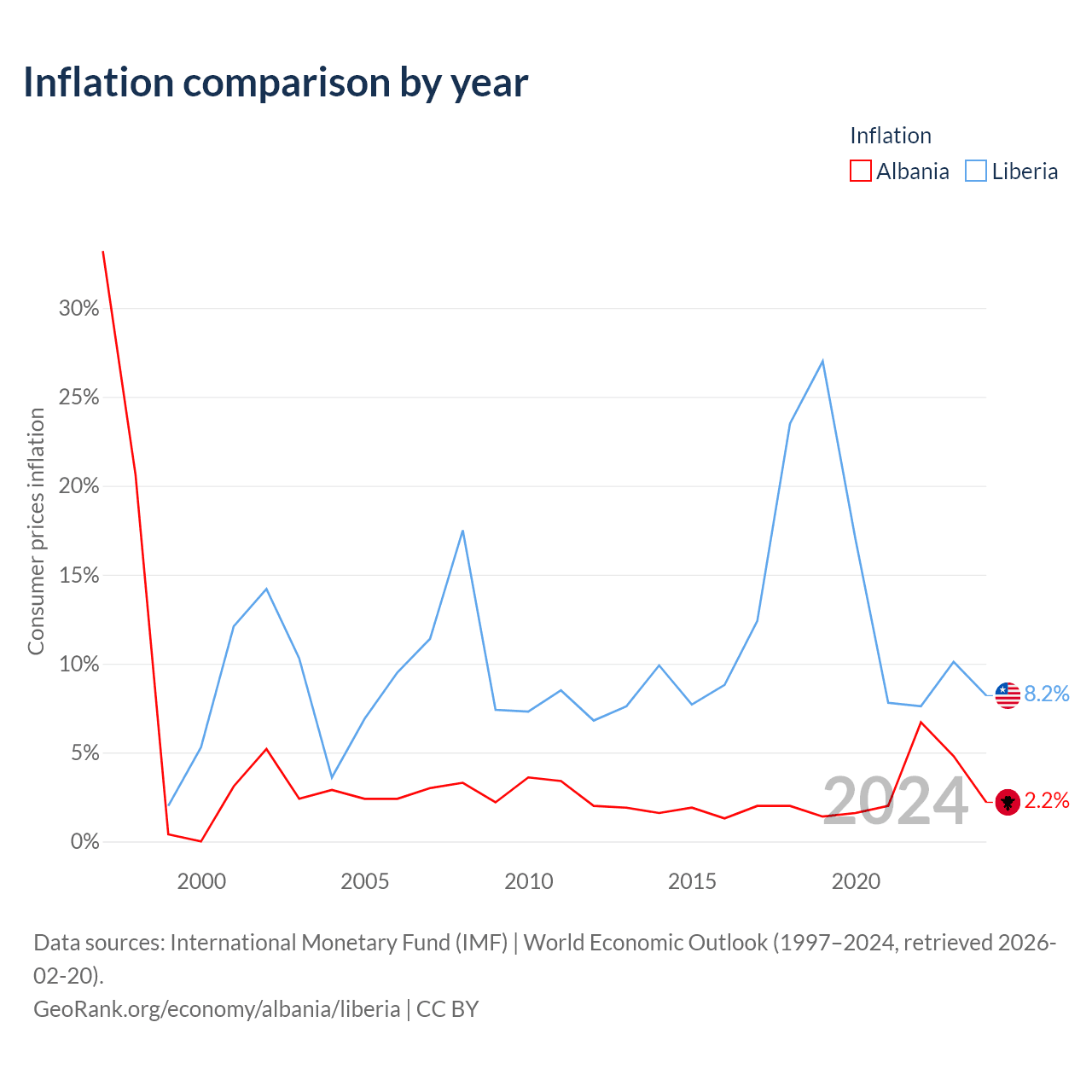 Albania has a GDP of $27B compared to $4.78B for Liberia, ranking 112/197 and 163/197 by economy size, respectively.