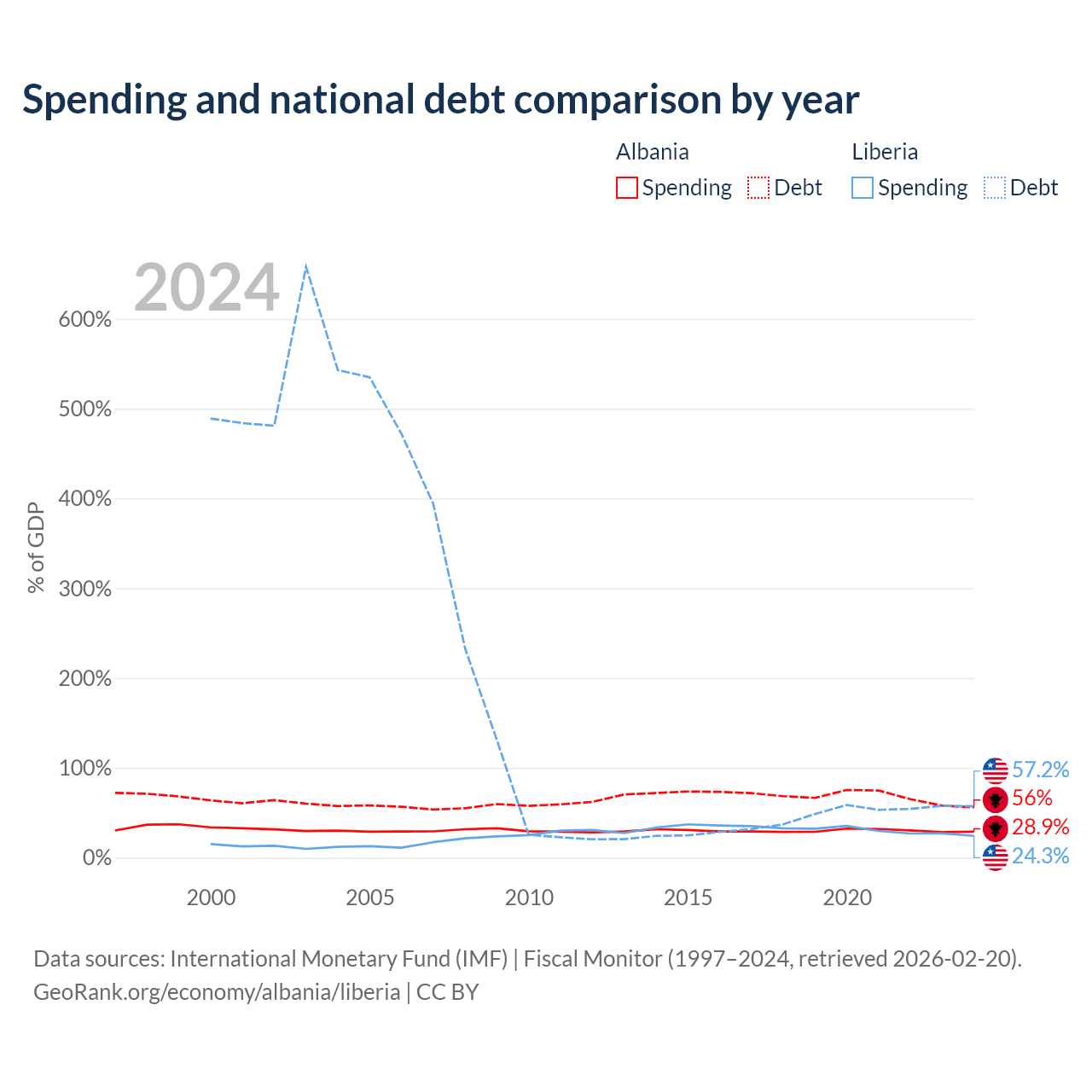 Albania has $15.2B in government debt (56% of GDP), compared to $2.73B (57.2% of GDP) in Liberia.