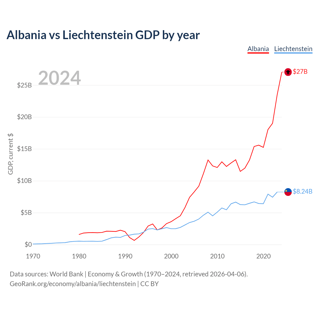 Albania has a GDP of $27B compared to $8.24B for Liechtenstein, ranking 112/197 and 156/197 by economy size, respectively.