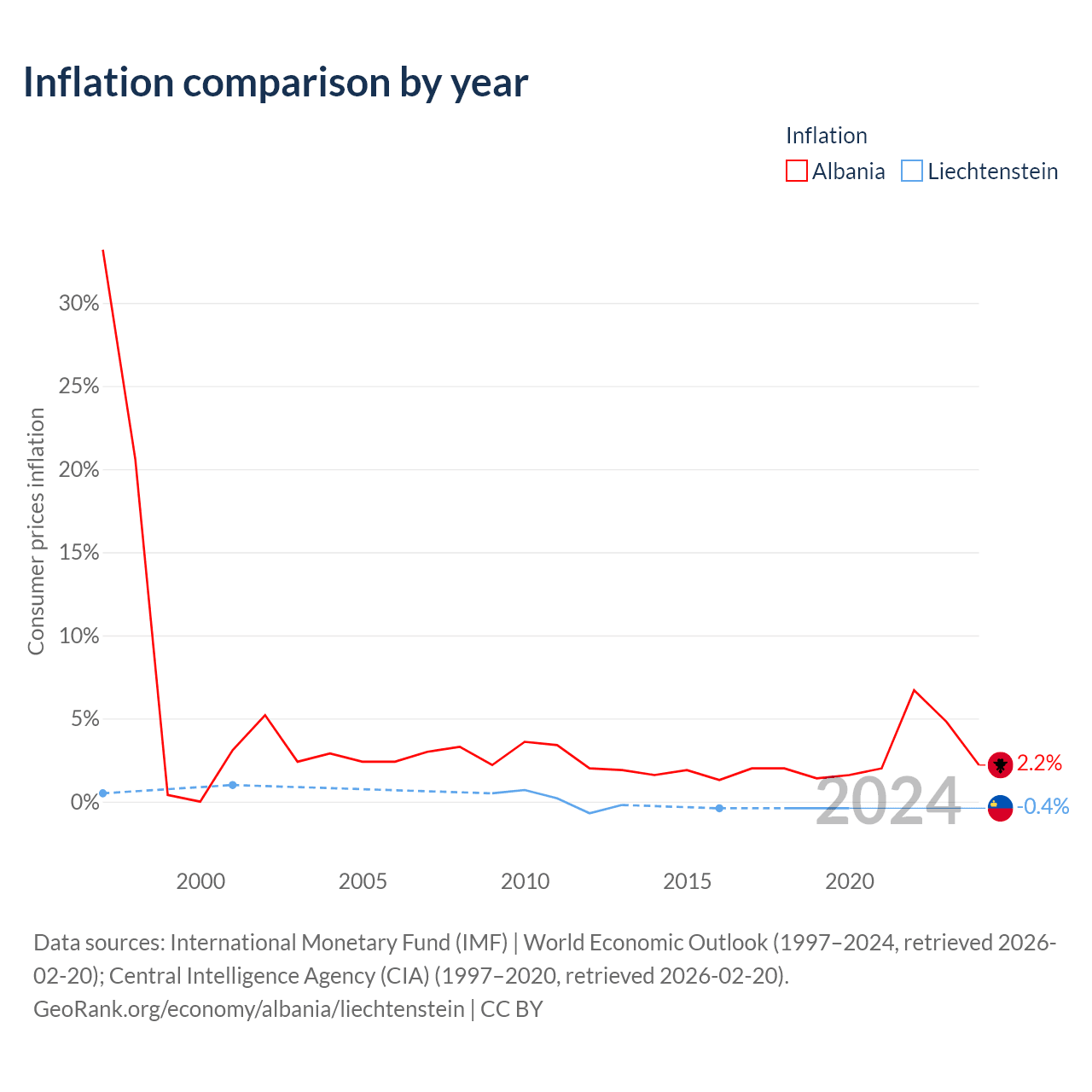 Over the past 24 years, Albania has recorded an average annual inflation rate of 4.33%, compared with 0.04% in Liechtenstein. In 2020, inflation was 2.2% in Albania and -0.4% in Liechtenstein.
