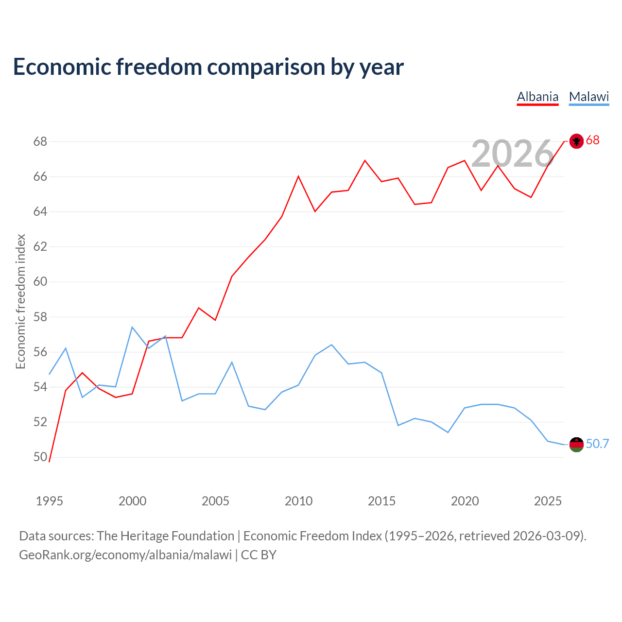 The Economic Freedom Index for Albania is 68, ranking 50/197, compared to 50.7 for Malawi, ranking 159/197. The chart above displays a comparison of annual changes in economic freedom indexes.