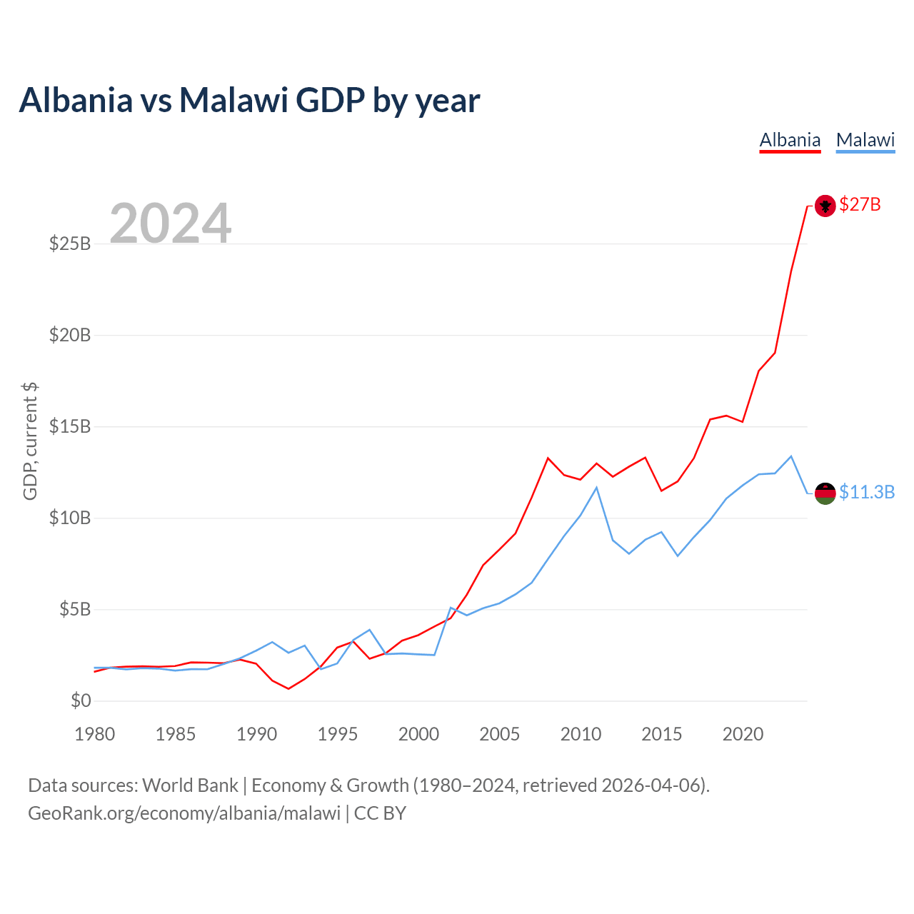 Albania vs Malawi GDP by year
