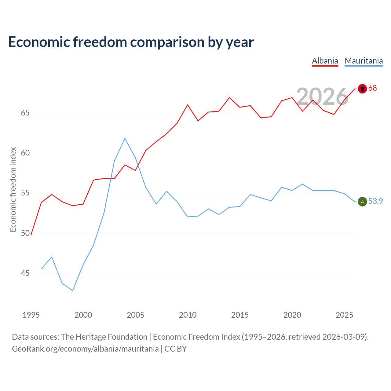 The Economic Freedom Index for Albania is 68, ranking 50/197, compared to 53.9 for Mauritania, ranking 136/197. The chart above displays a comparison of annual changes in economic freedom indexes.