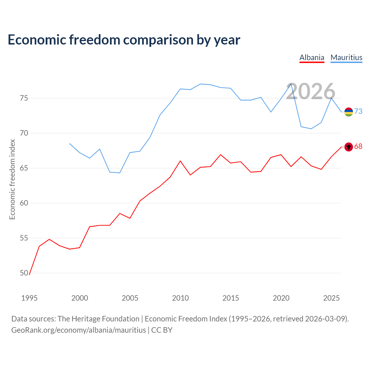 The Economic Freedom Index for Albania is 68, ranking 50/197, compared to 73 for Mauritius, ranking 26/197. The chart above displays a comparison of annual changes in economic freedom indexes.