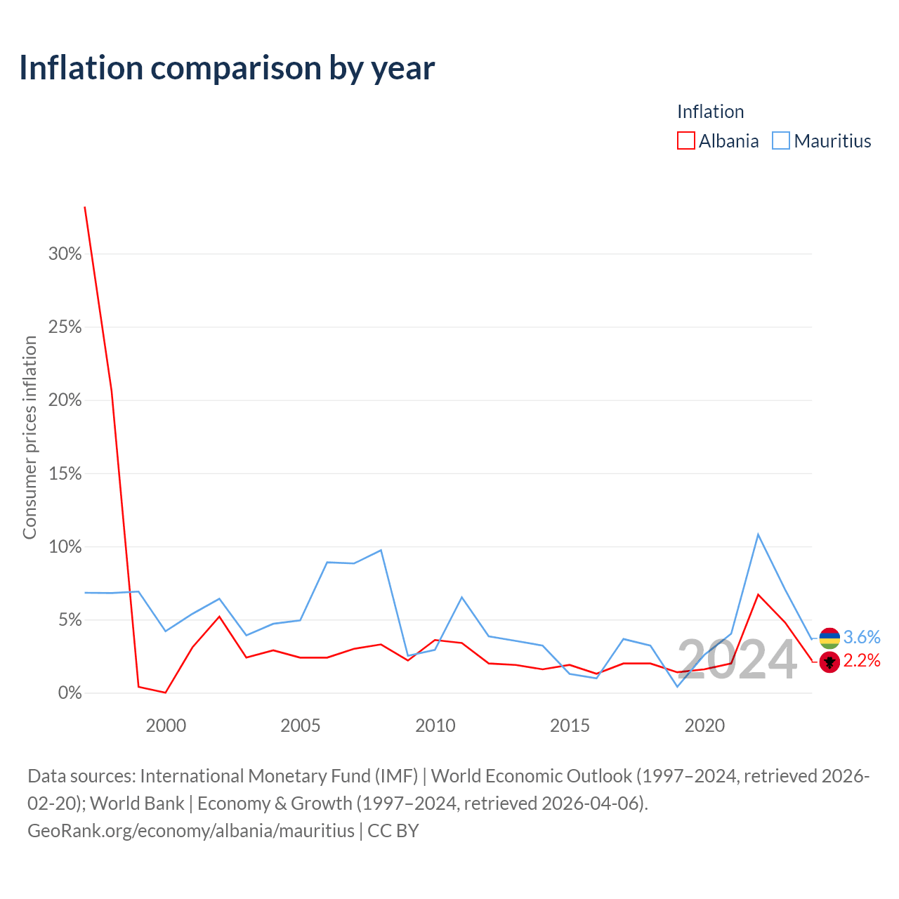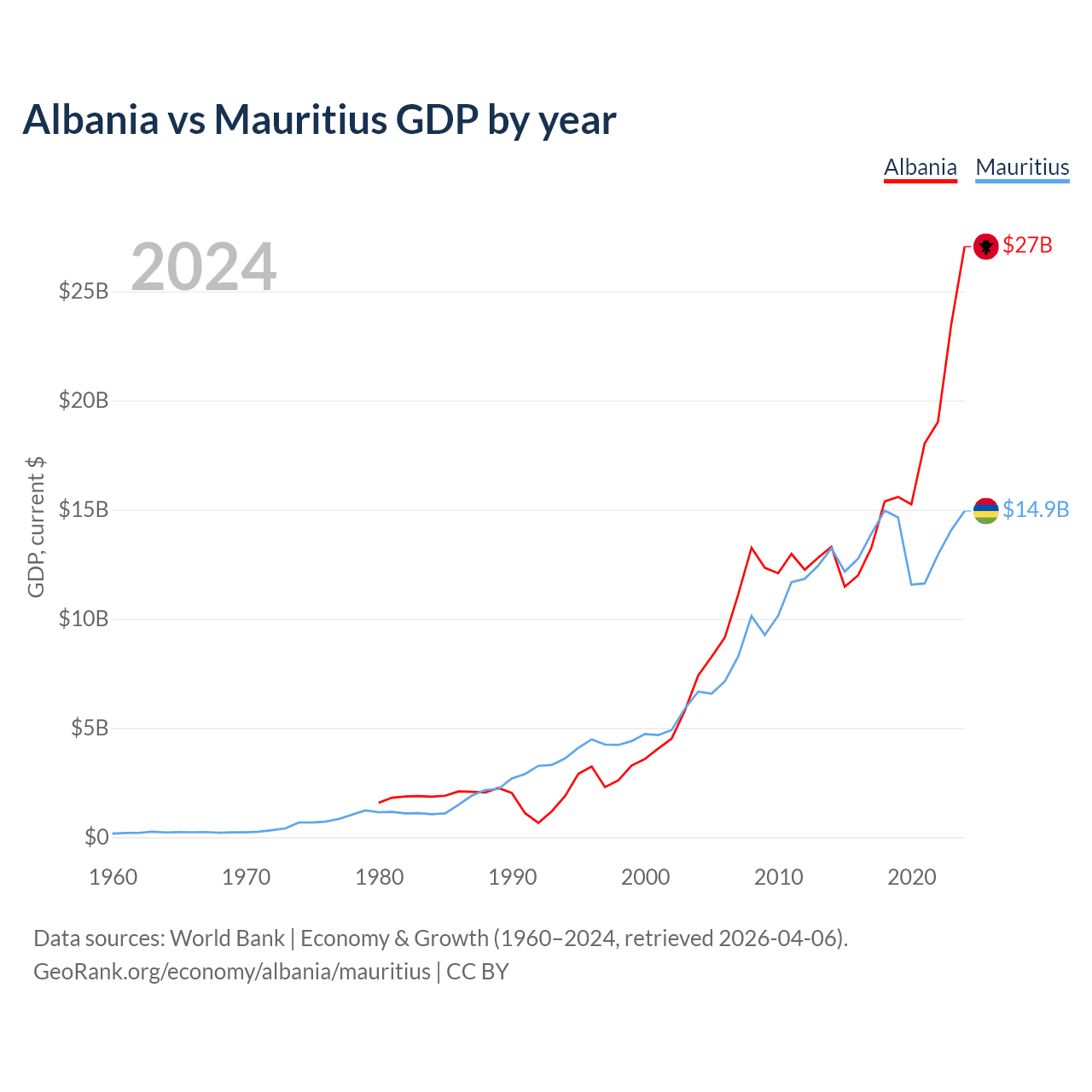 Albania has a GDP of $27B compared to $14.9B for Mauritius, ranking 112/197 and 143/197 by economy size, respectively.