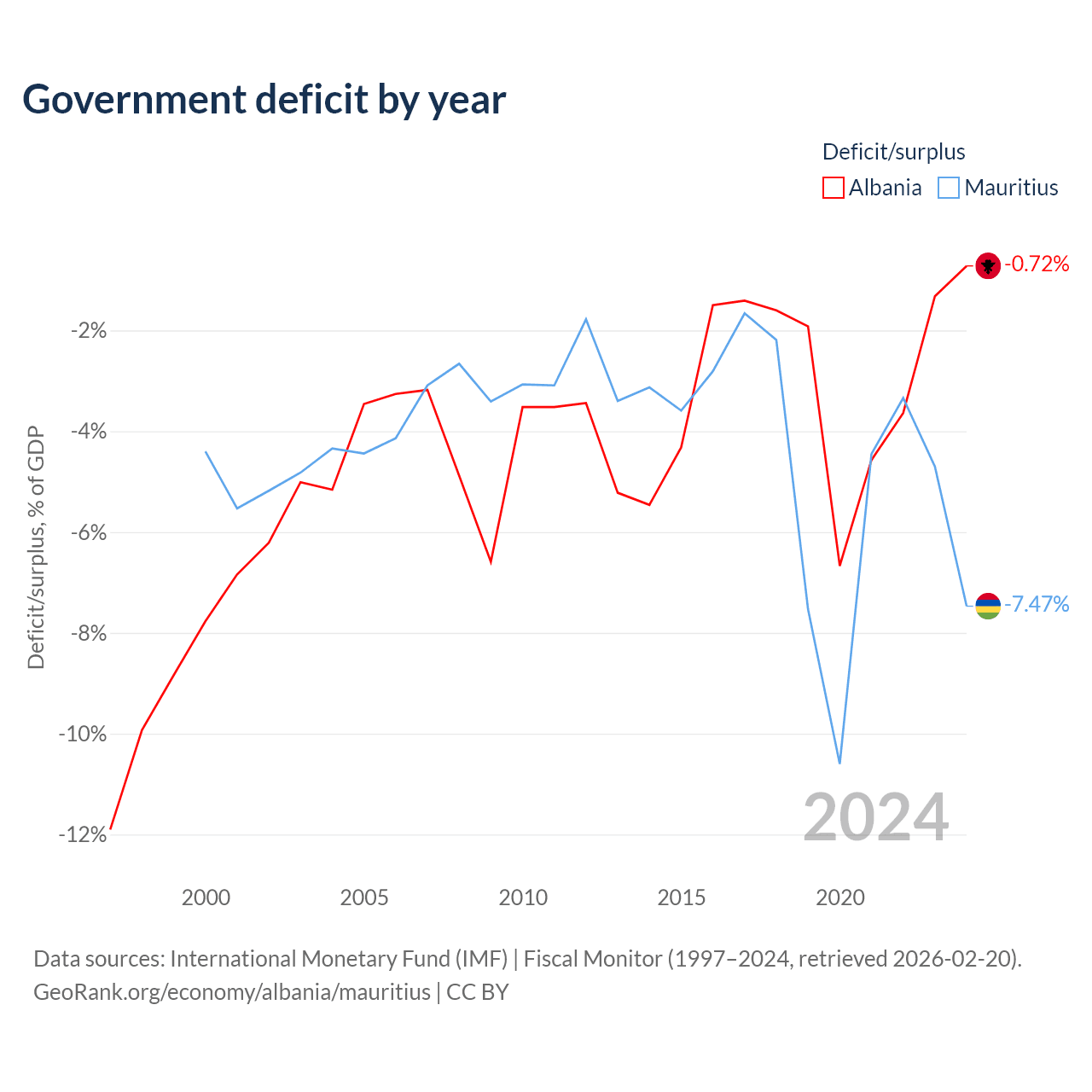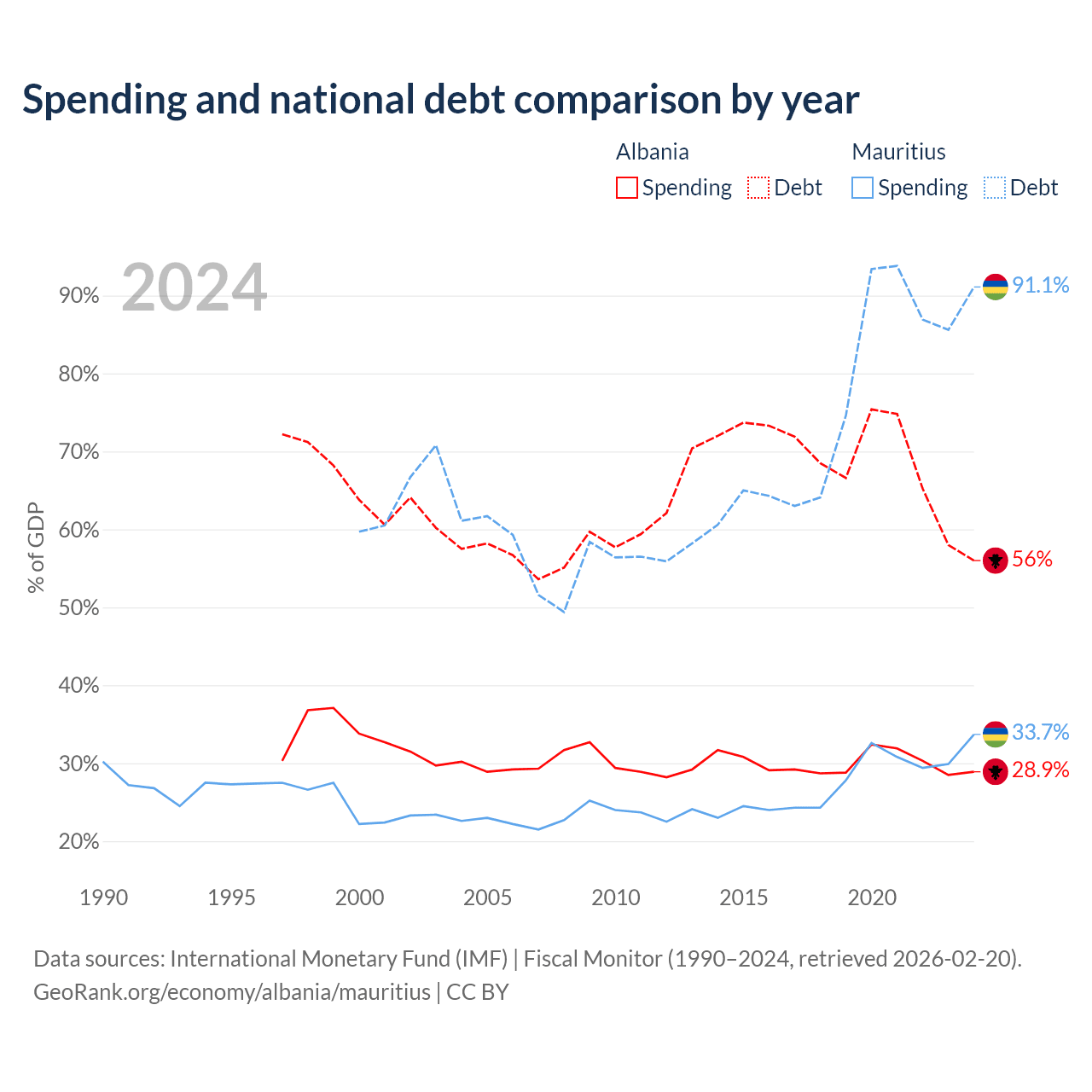 Albania has $15.2B in government debt (56% of GDP), compared to $13.6B (91.1% of GDP) in Mauritius.