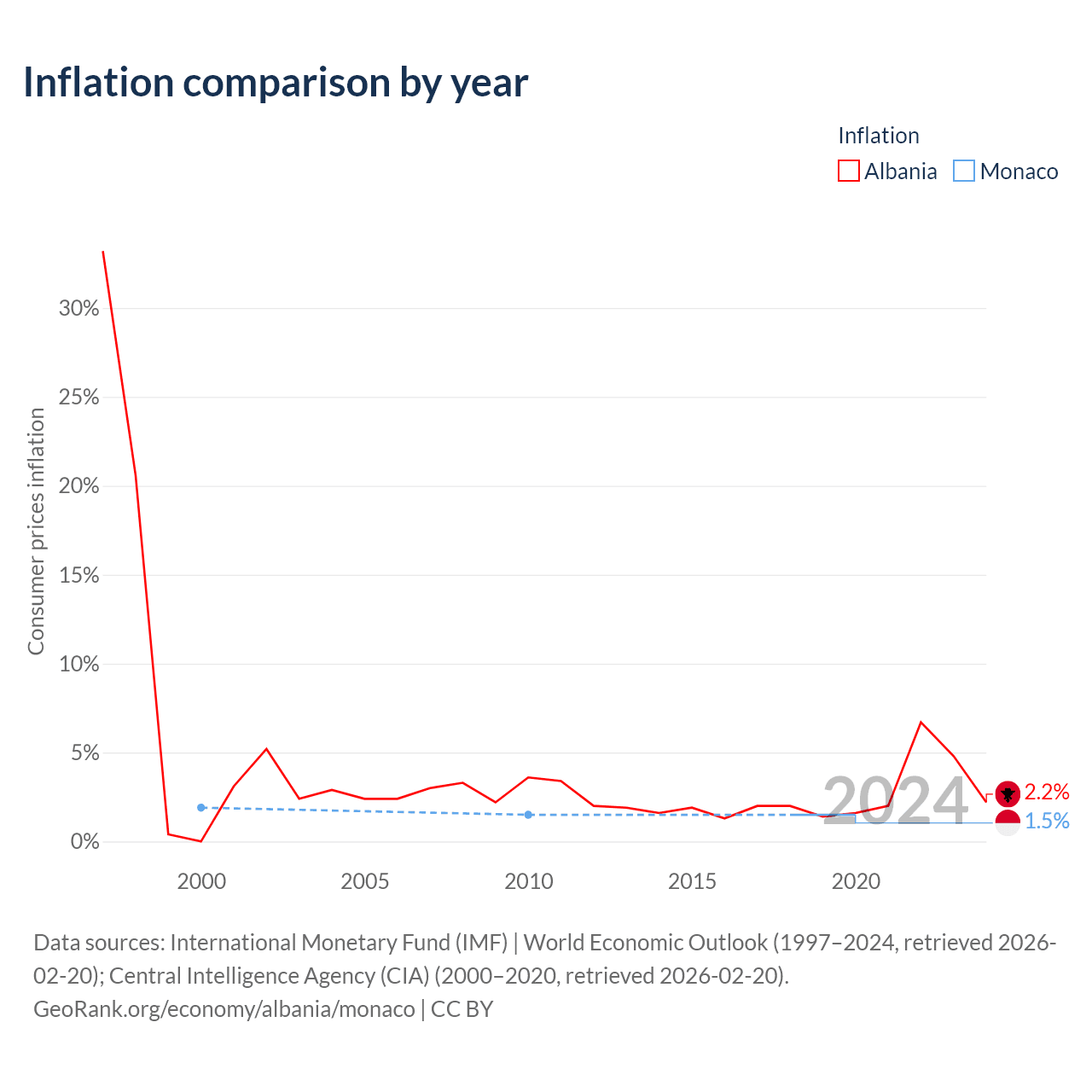 Over the past 21 years, Albania has recorded an average annual inflation rate of 2.36%, compared with 1.58% in Monaco. In 2020, inflation was 2.2% in Albania and 1.5% in Monaco.