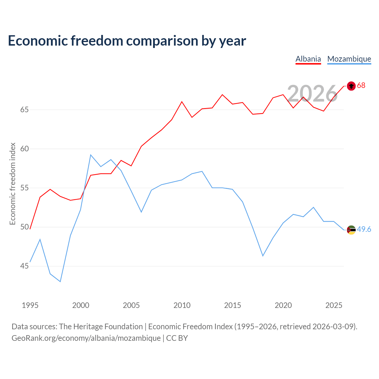 The Economic Freedom Index for Albania is 68, ranking 50/197, compared to 49.6 for Mozambique, ranking 164/197. The chart above displays a comparison of annual changes in economic freedom indexes.