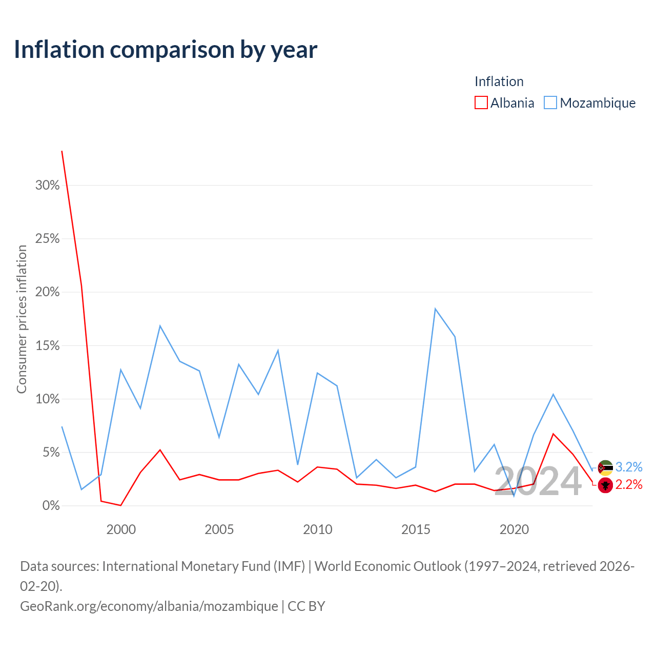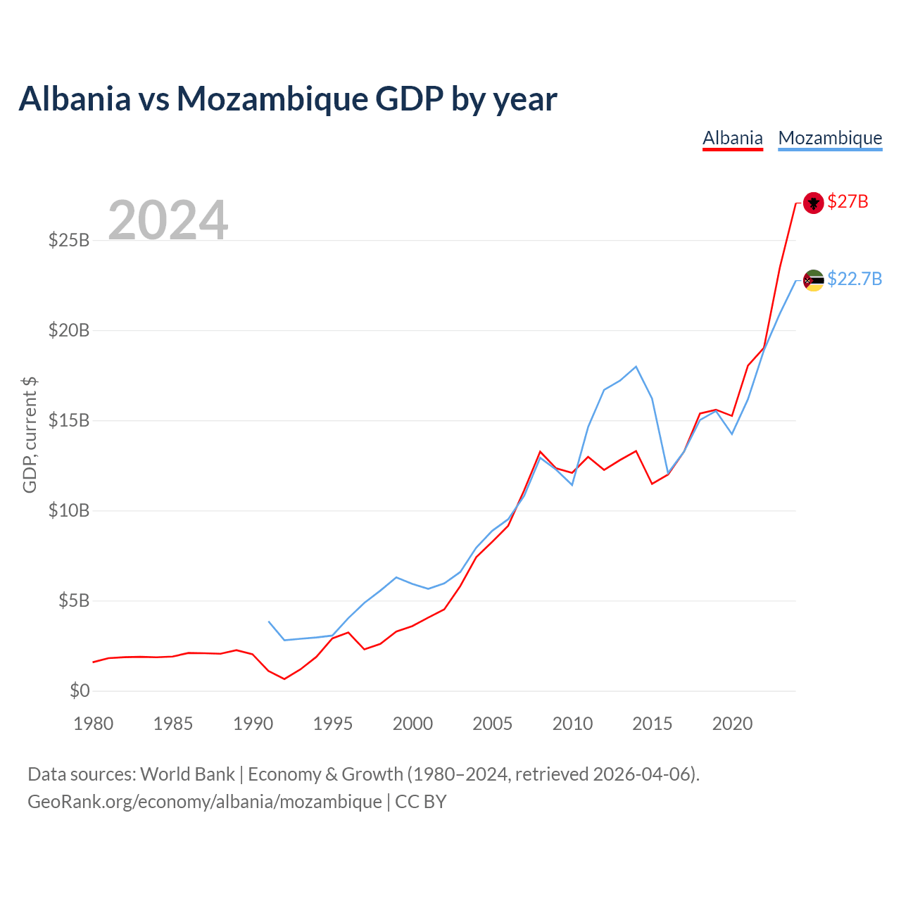 Albania has a GDP of $27B compared to $22.7B for Mozambique, ranking 112/197 and 123/197 by economy size, respectively.