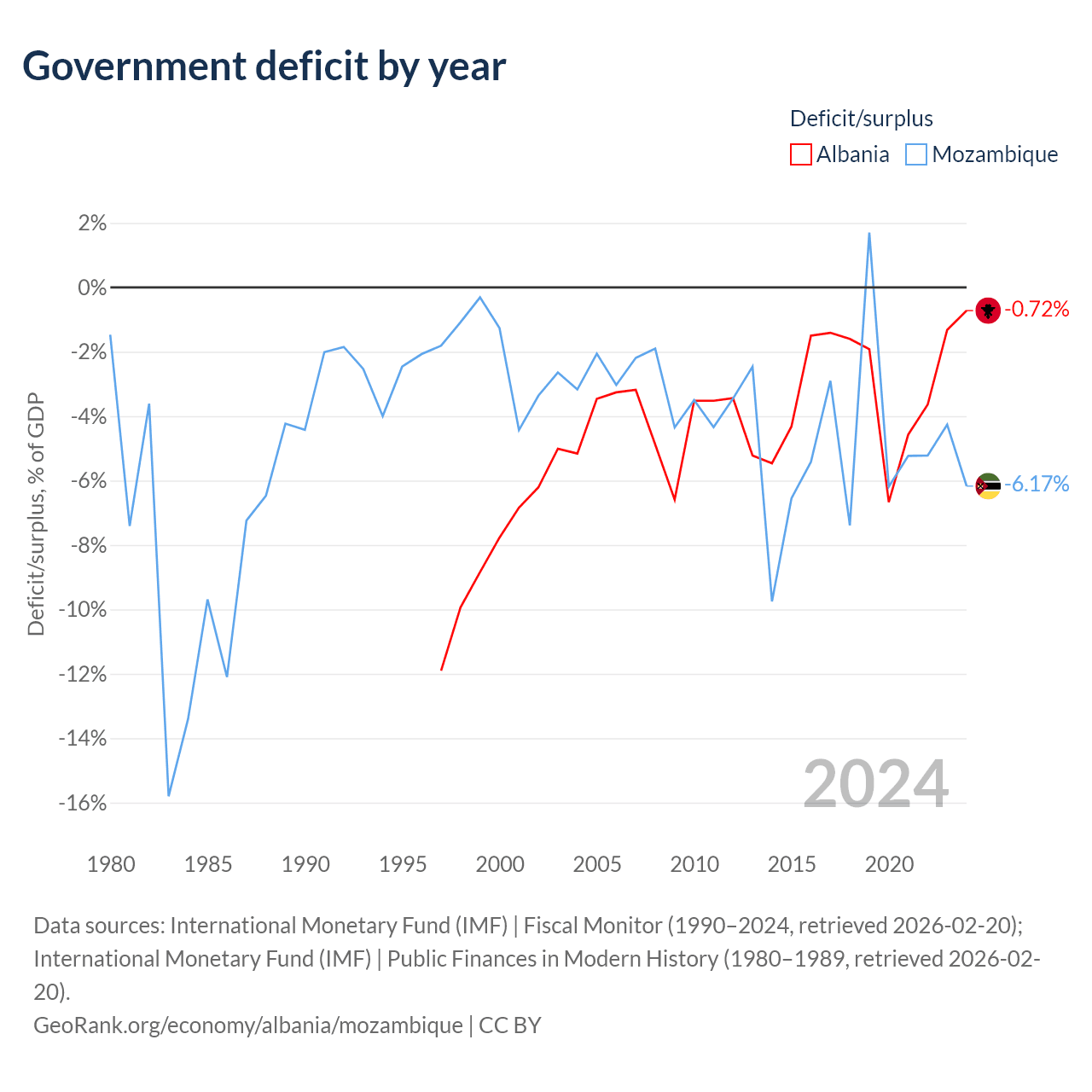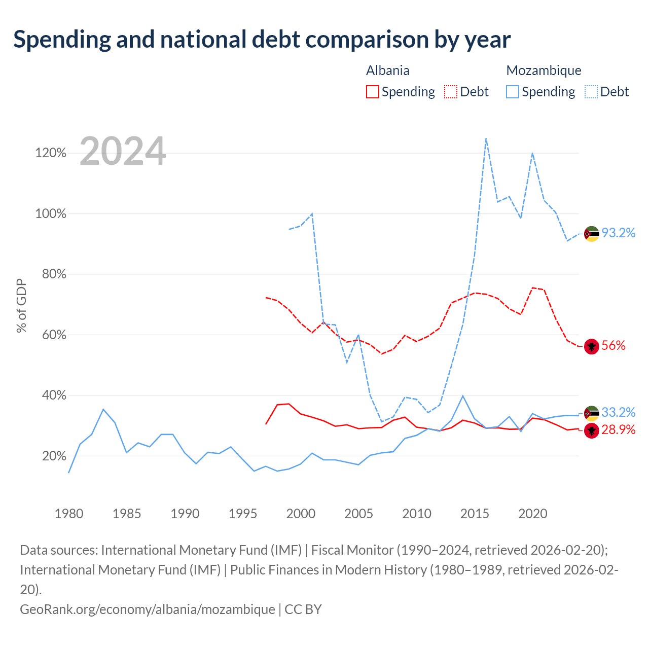 Albania has $15.2B in government debt (56% of GDP), compared to $21.2B (93.2% of GDP) in Mozambique.