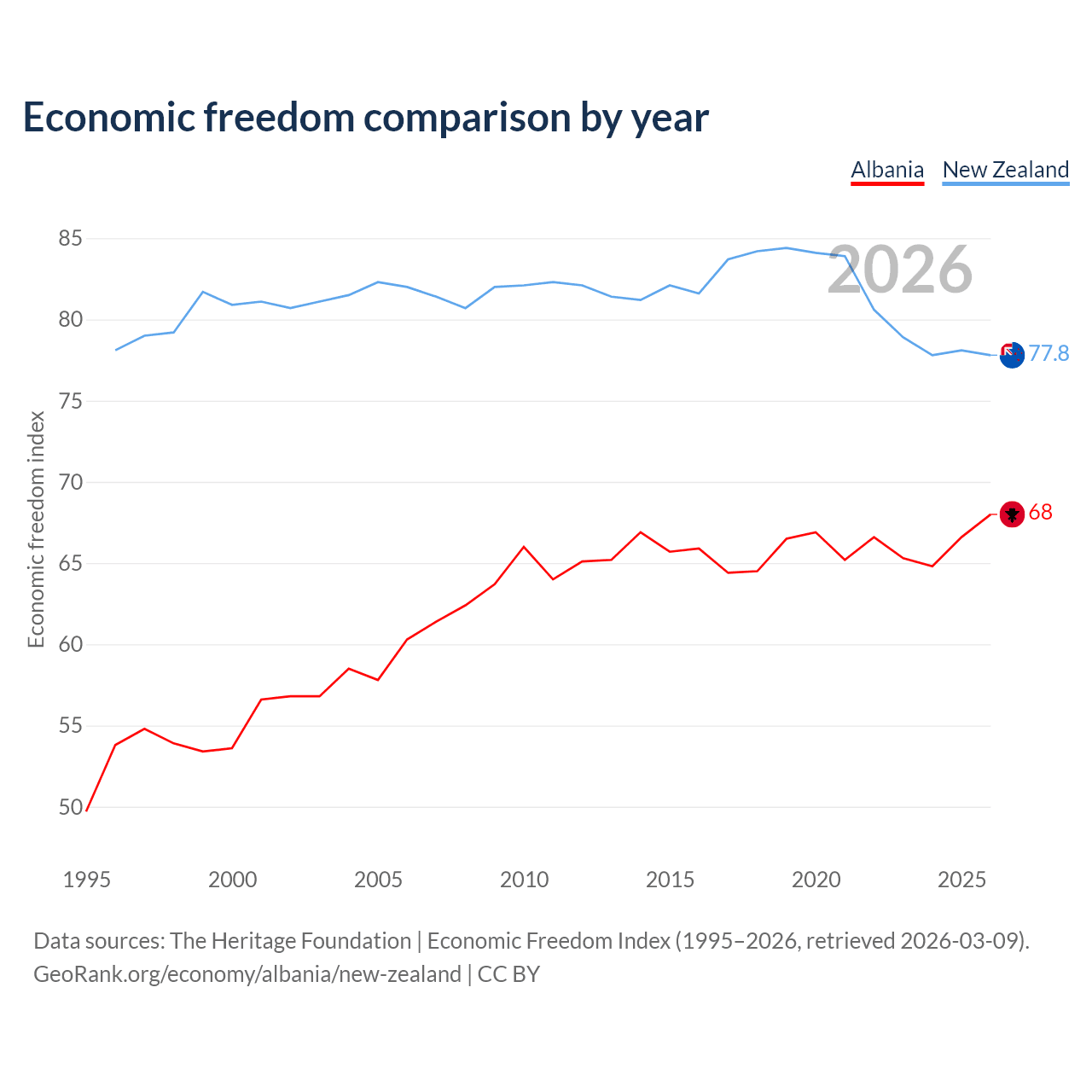 The Economic Freedom Index for Albania is 68, ranking 50/197, compared to 77.8 for New Zealand, ranking 13/197. The chart above displays a comparison of annual changes in economic freedom indexes.