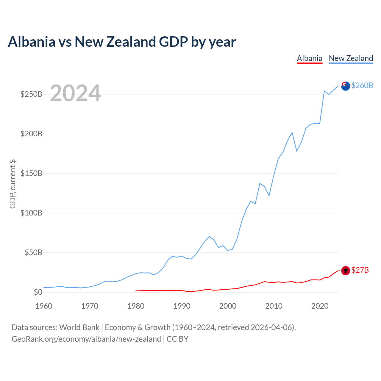 Albania vs New Zealand GDP by year