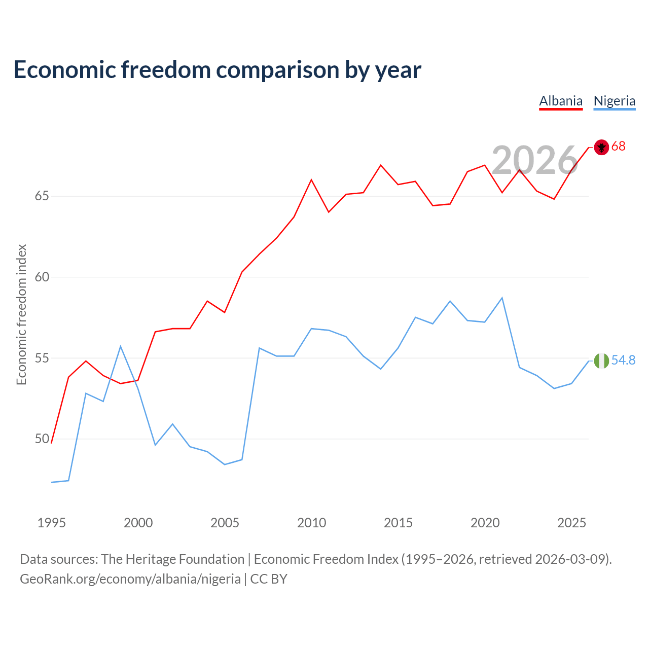 The Economic Freedom Index for Albania is 68, ranking 50/197, compared to 54.8 for Nigeria, ranking 132/197. The chart above displays a comparison of annual changes in economic freedom indexes.