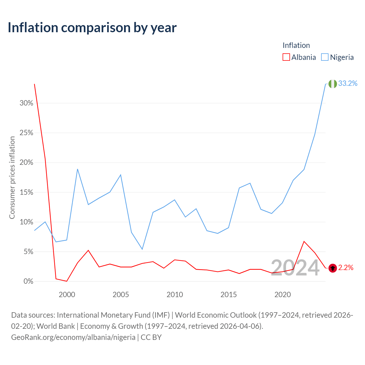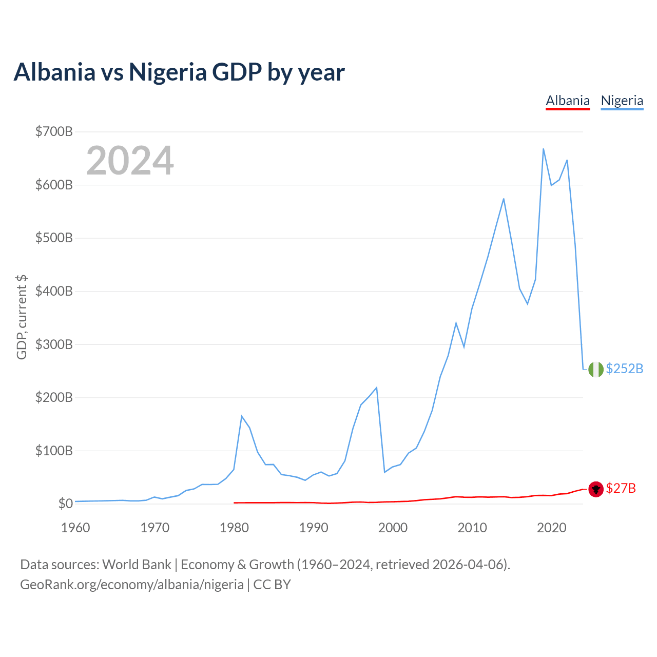 Albania has a GDP of $27B compared to $252B for Nigeria, ranking 112/197 and 54/197 by economy size, respectively.