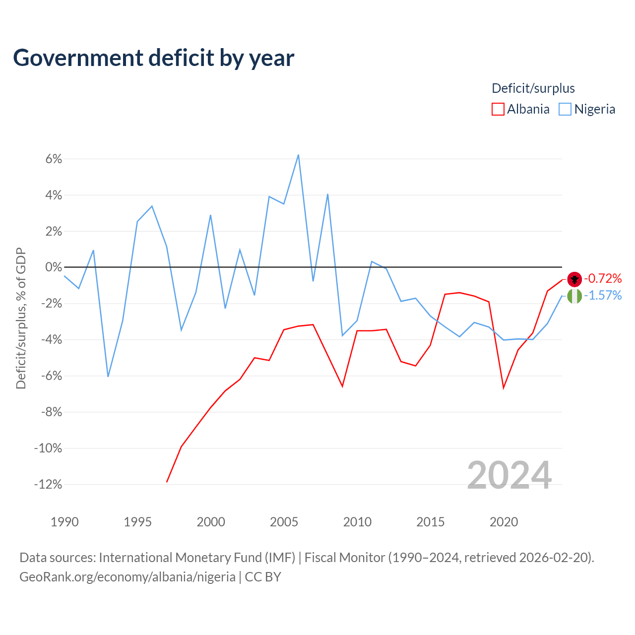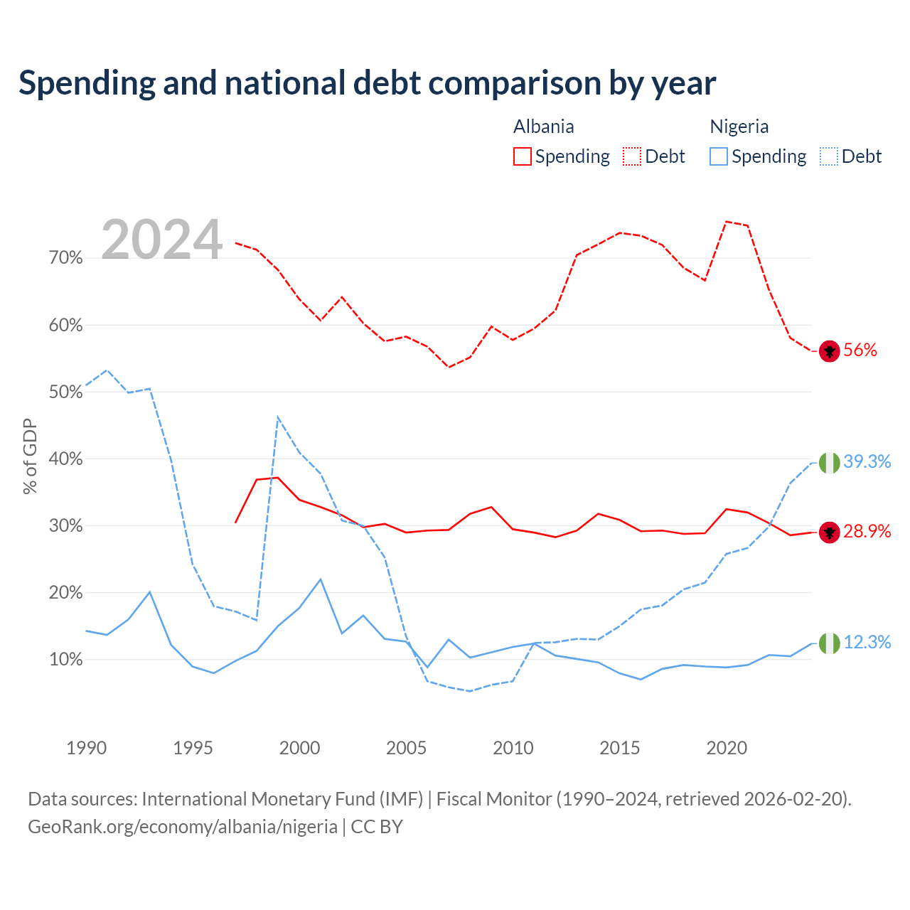Albania has $15.2B in government debt (56% of GDP), compared to $99.2B (39.3% of GDP) in Nigeria.
