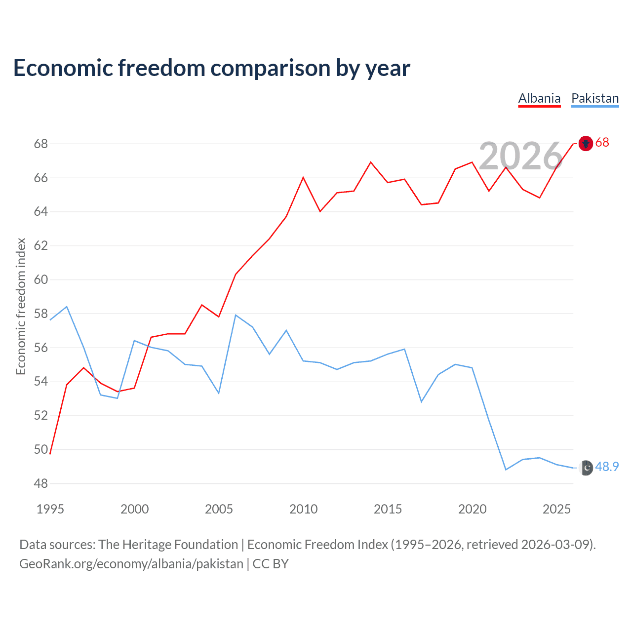 The Economic Freedom Index for Albania is 68, ranking 50/197, compared to 48.9 for Pakistan, ranking 168/197. The chart above displays a comparison of annual changes in economic freedom indexes.