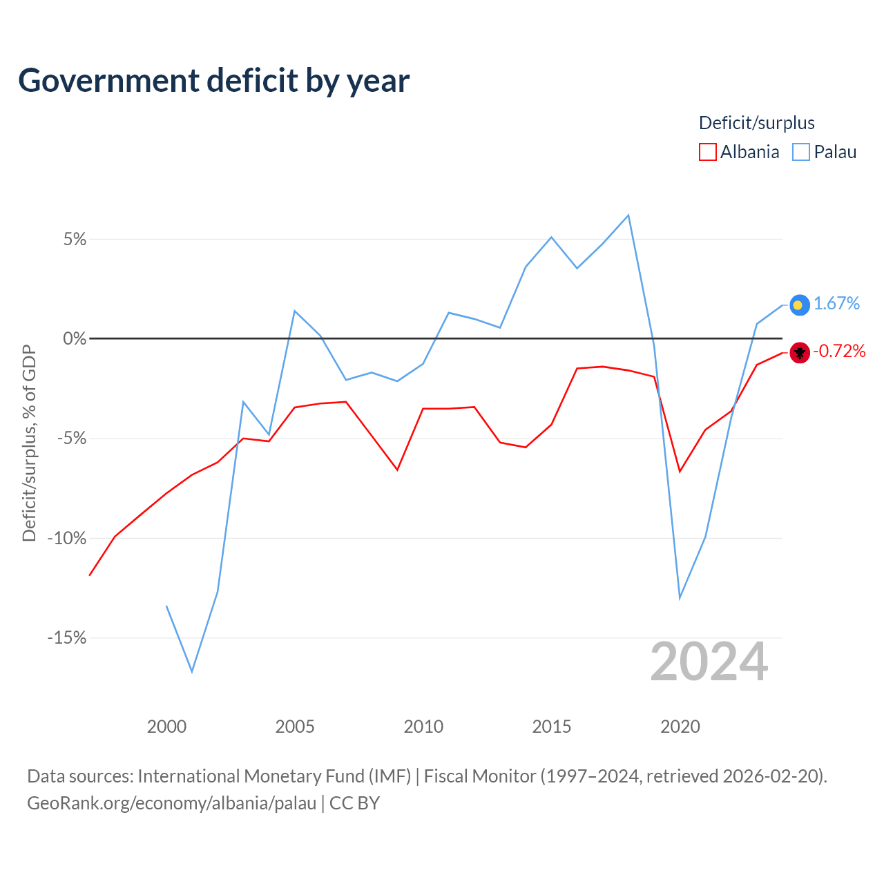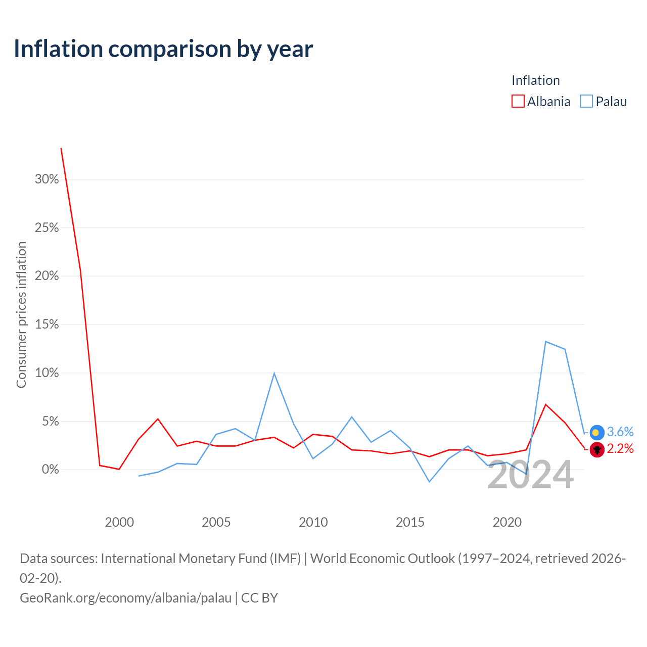 Albania has a GDP of $27B compared to $277M for Palau, ranking 112/197 and 194/197 by economy size, respectively.