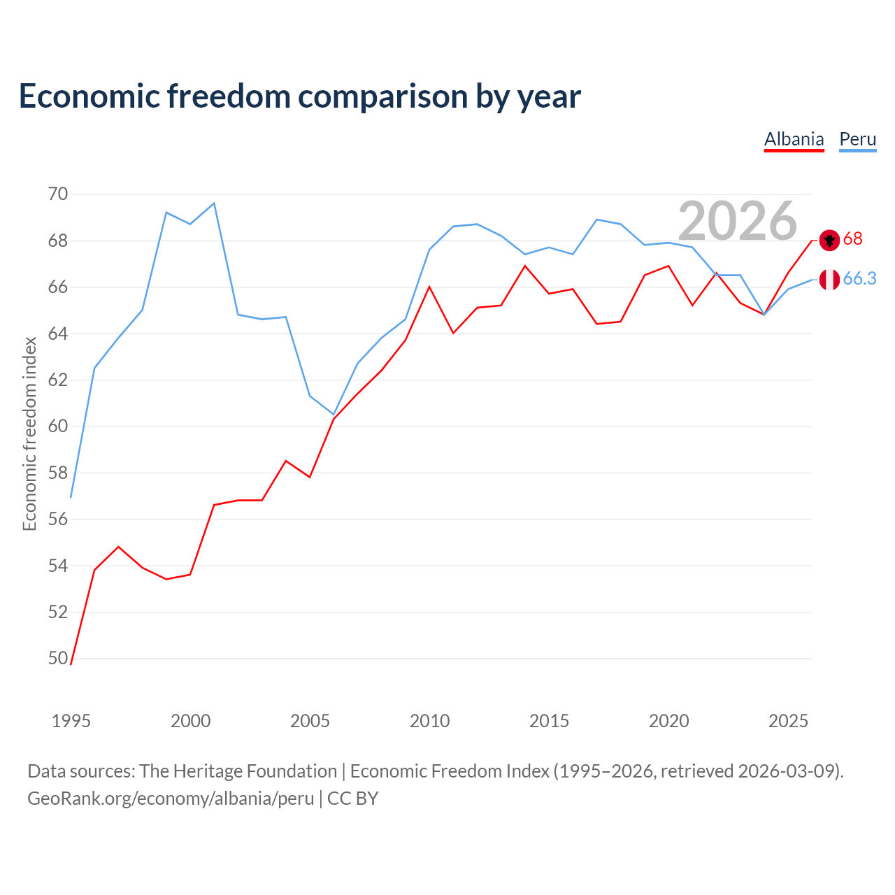 The Economic Freedom Index for Albania is 68, ranking 50/197, compared to 66.3 for Peru, ranking 62/197. The chart above displays a comparison of annual changes in economic freedom indexes.