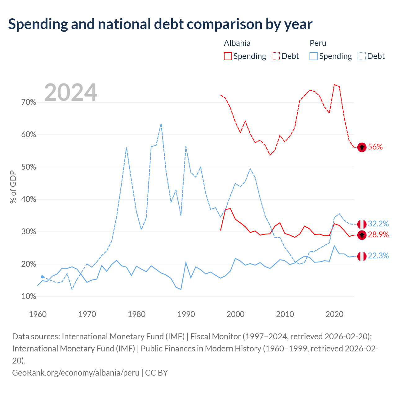 Albania has $15.2B in government debt (56% of GDP), compared to $93B (32.2% of GDP) in Peru.