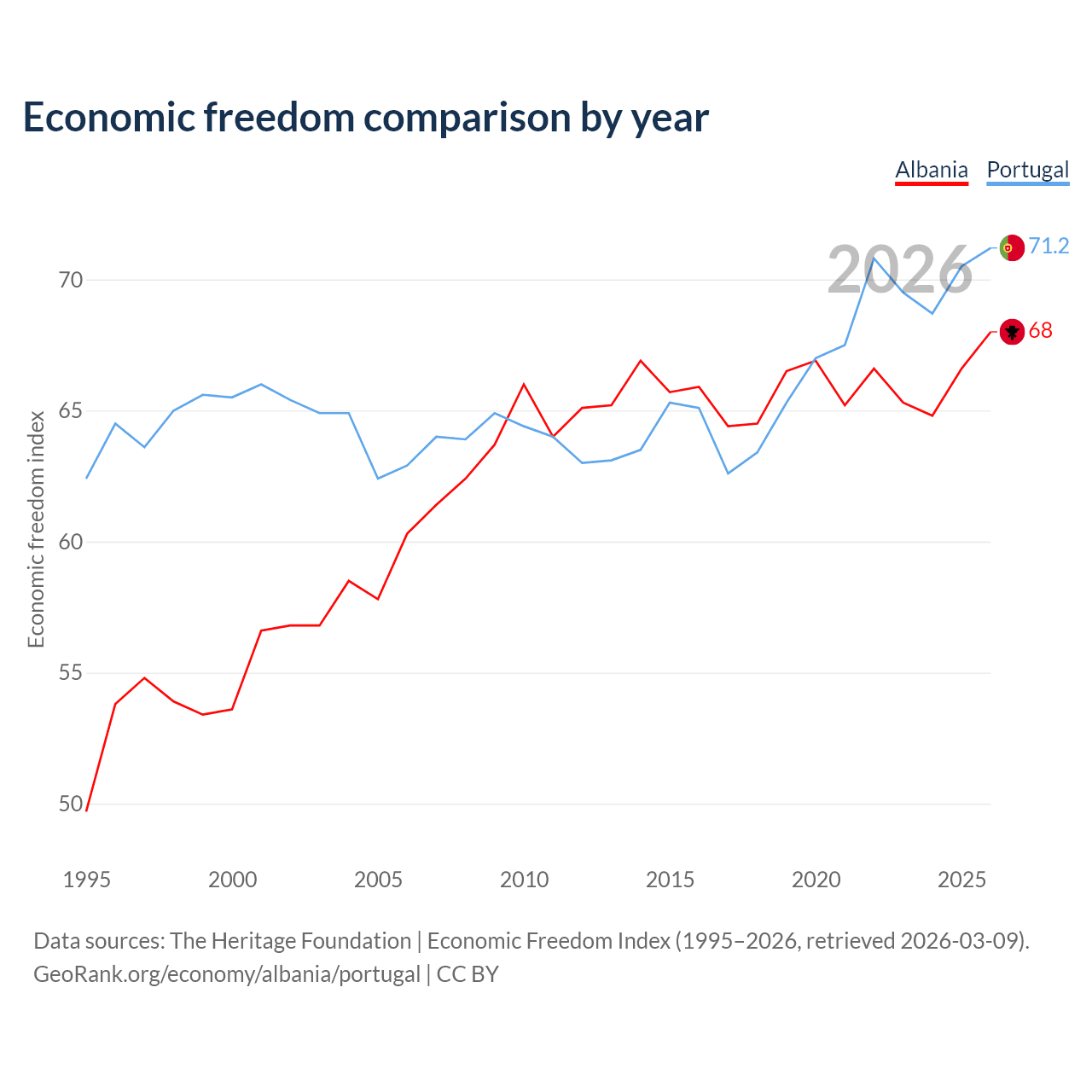 The Economic Freedom Index for Albania is 68, ranking 50/197, compared to 71.2 for Portugal, ranking 33/197. The chart above displays a comparison of annual changes in economic freedom indexes.