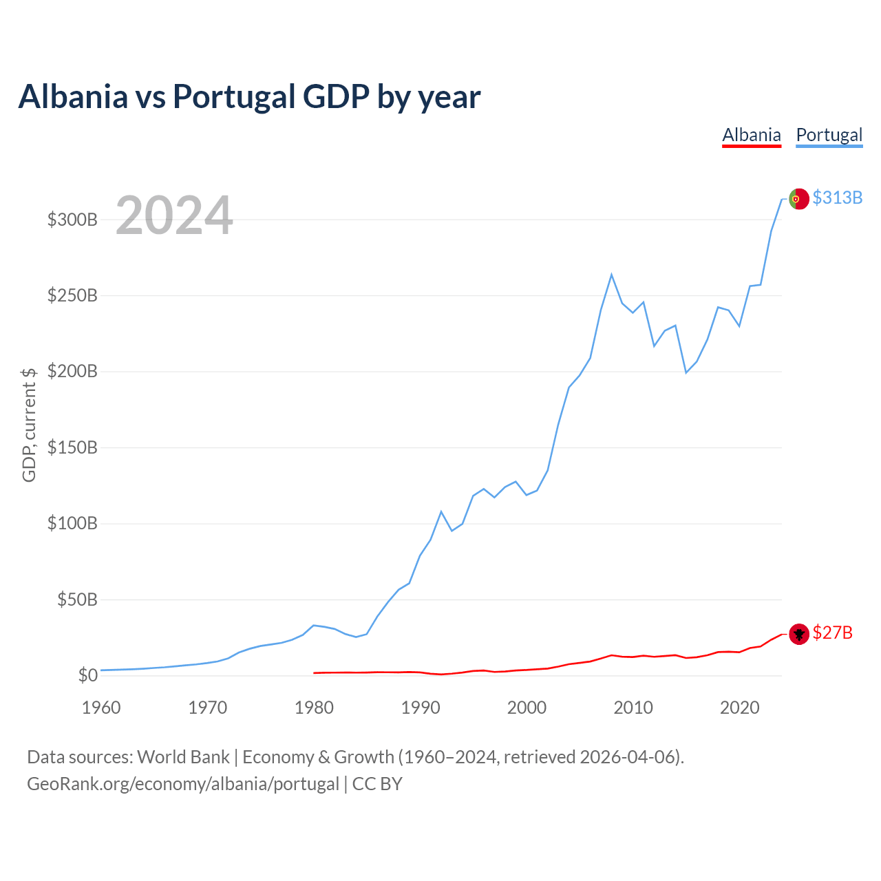 Albania has a GDP of $27B compared to $313B for Portugal, ranking 112/197 and 46/197 by economy size, respectively.