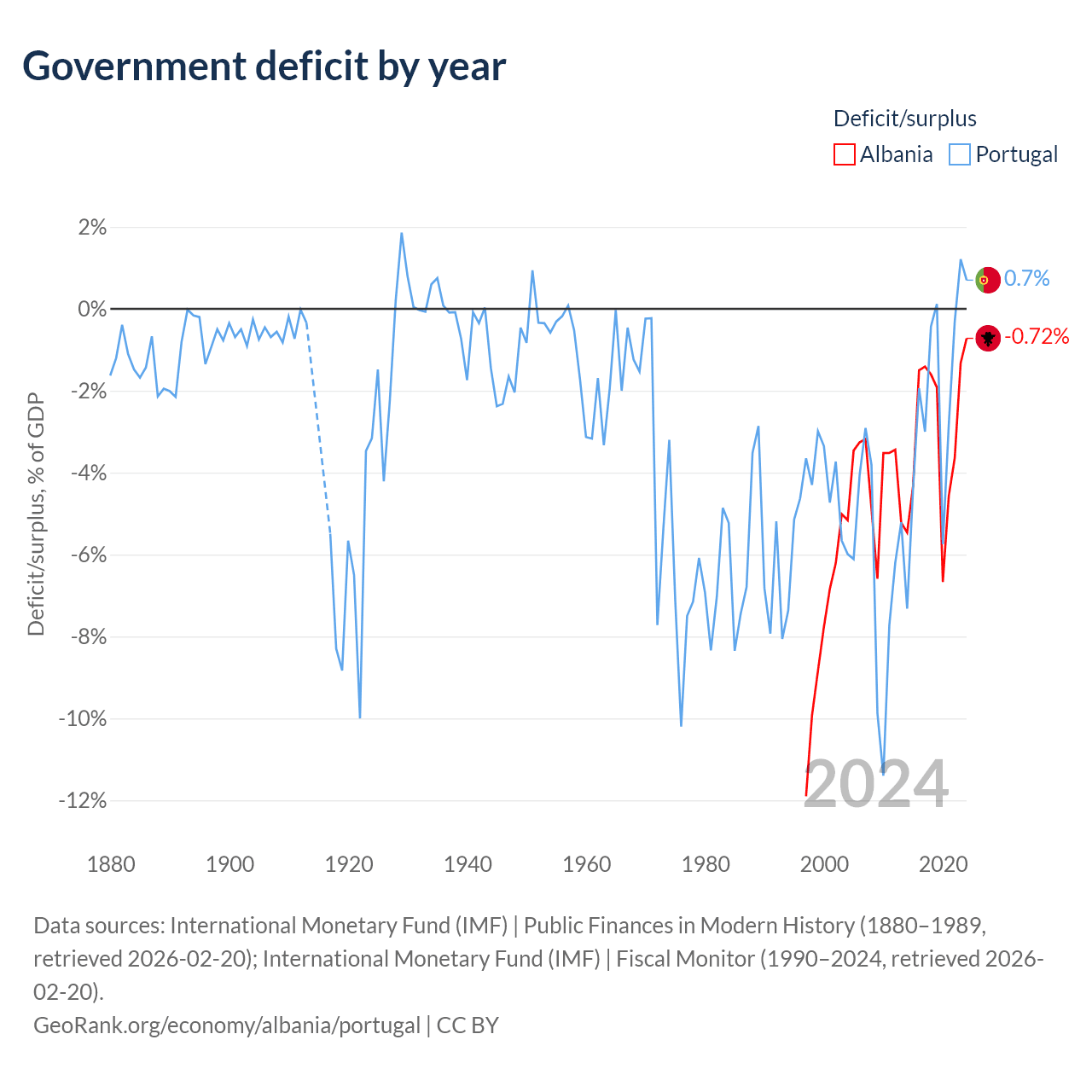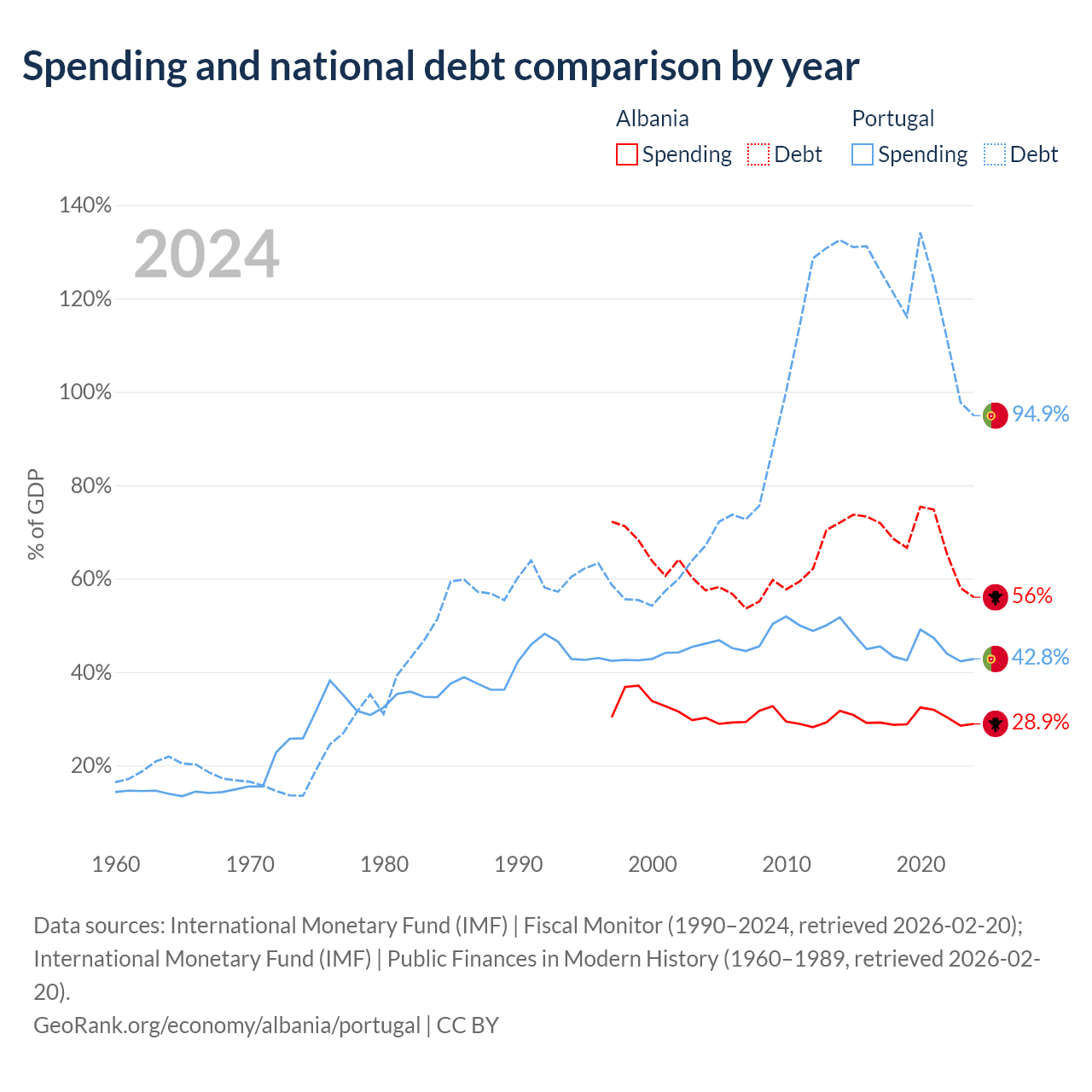 Albania has $15.2B in government debt (56% of GDP), compared to $297B (94.9% of GDP) in Portugal.