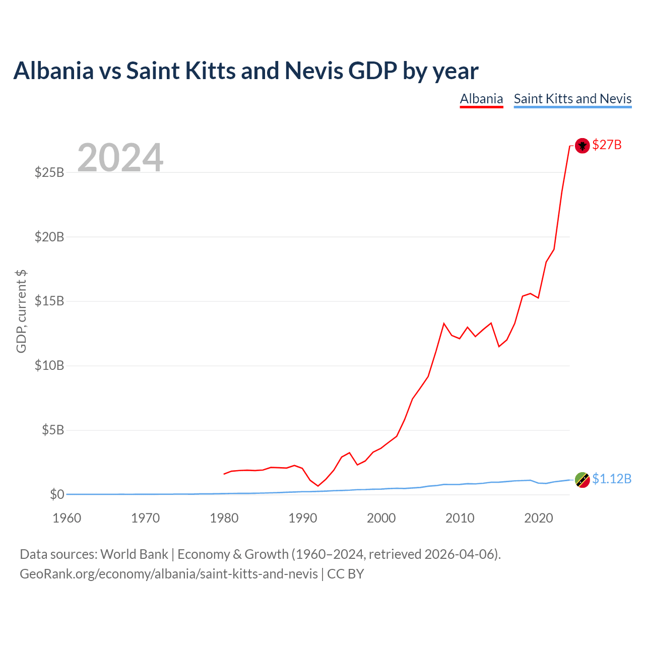 Albania has a GDP of $27B compared to $1.12B for Saint Kitts and Nevis, ranking 112/197 and 187/197 by economy size, respectively.