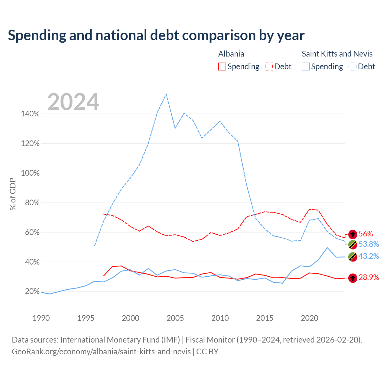 Albania has $15.2B in government debt (56% of GDP), compared to $604M (53.8% of GDP) in Saint Kitts and Nevis.