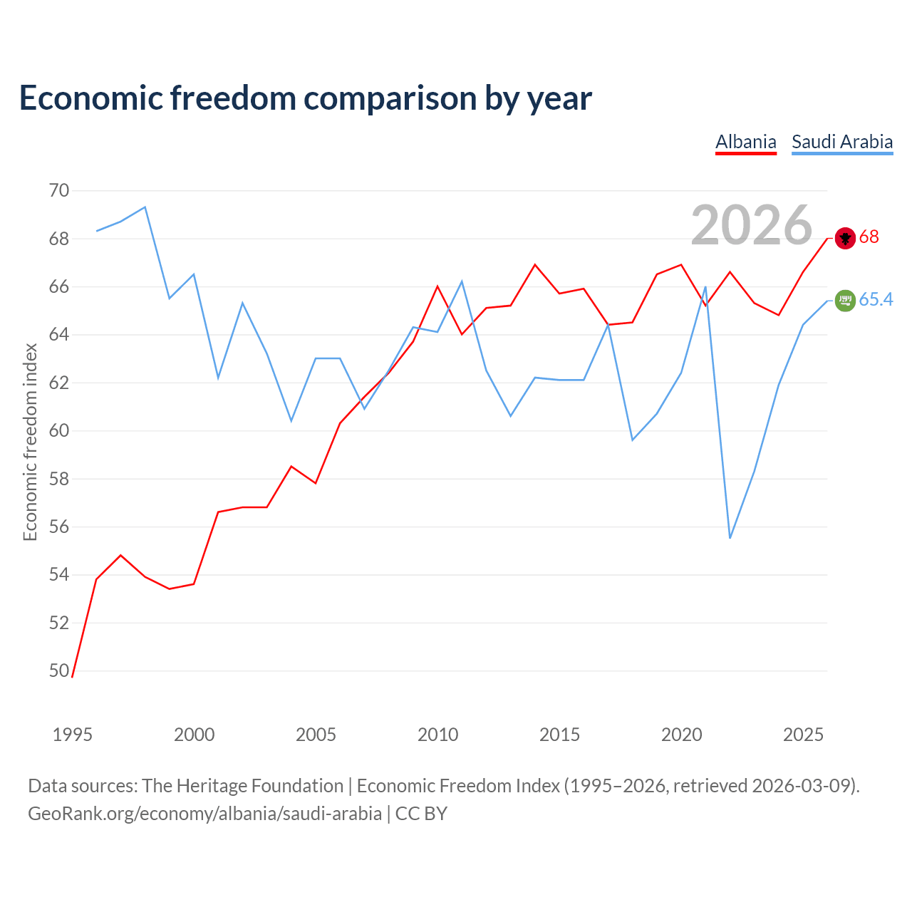 The Economic Freedom Index for Albania is 68, ranking 50/197, compared to 65.4 for Saudi Arabia, ranking 65/197. The chart above displays a comparison of annual changes in economic freedom indexes.