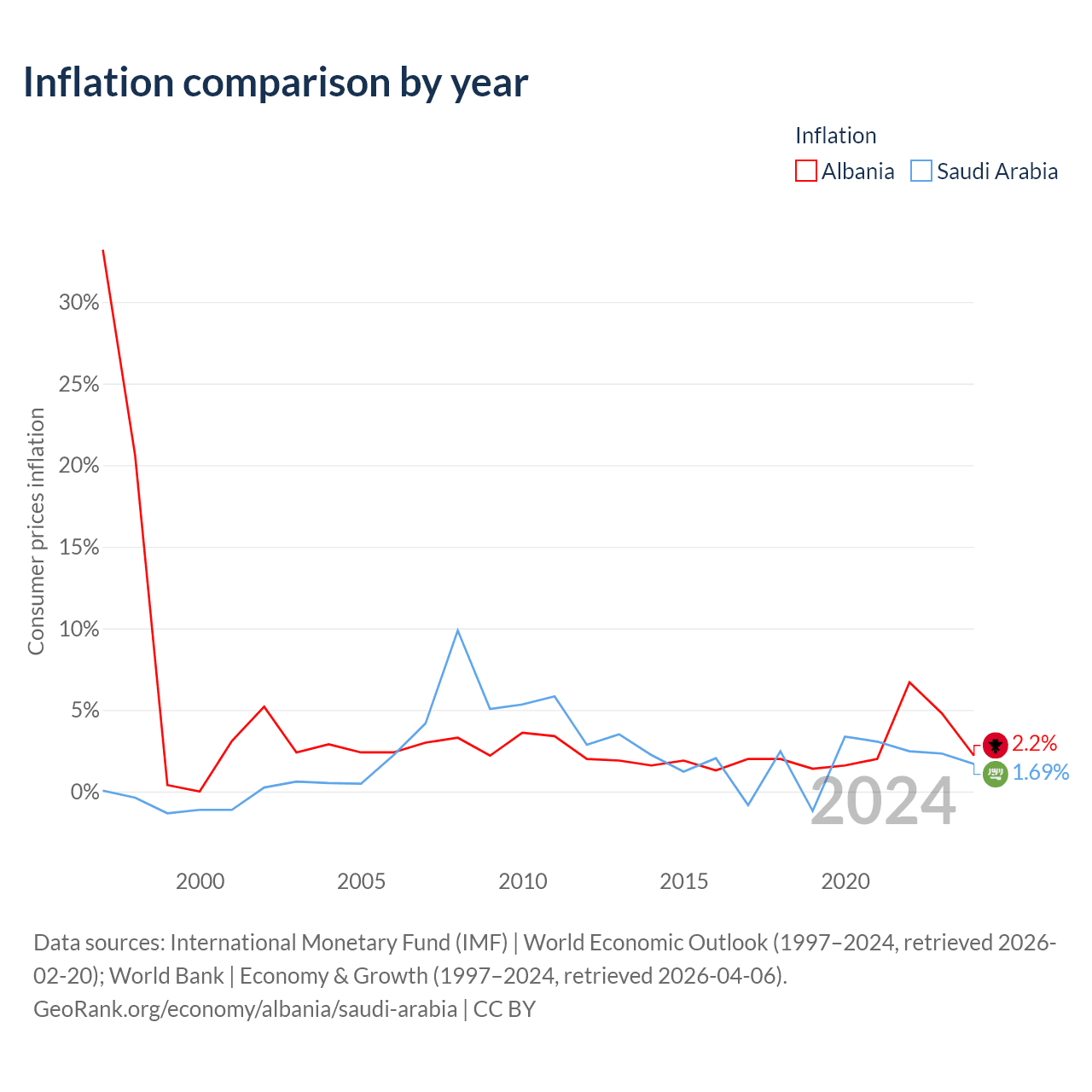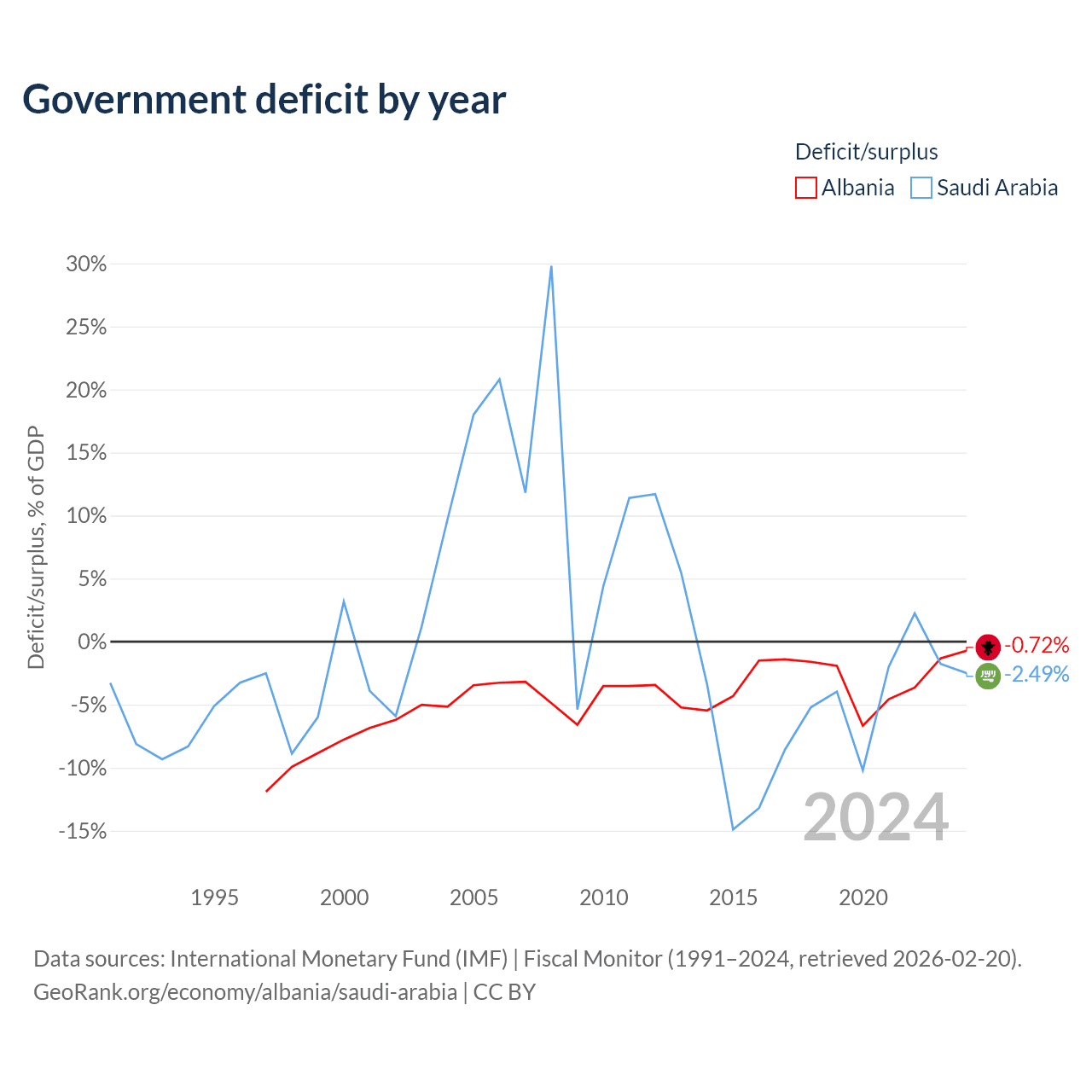 Albania has a GDP of $27B compared to $1.24T for Saudi Arabia, ranking 112/197 and 18/197 by economy size, respectively.