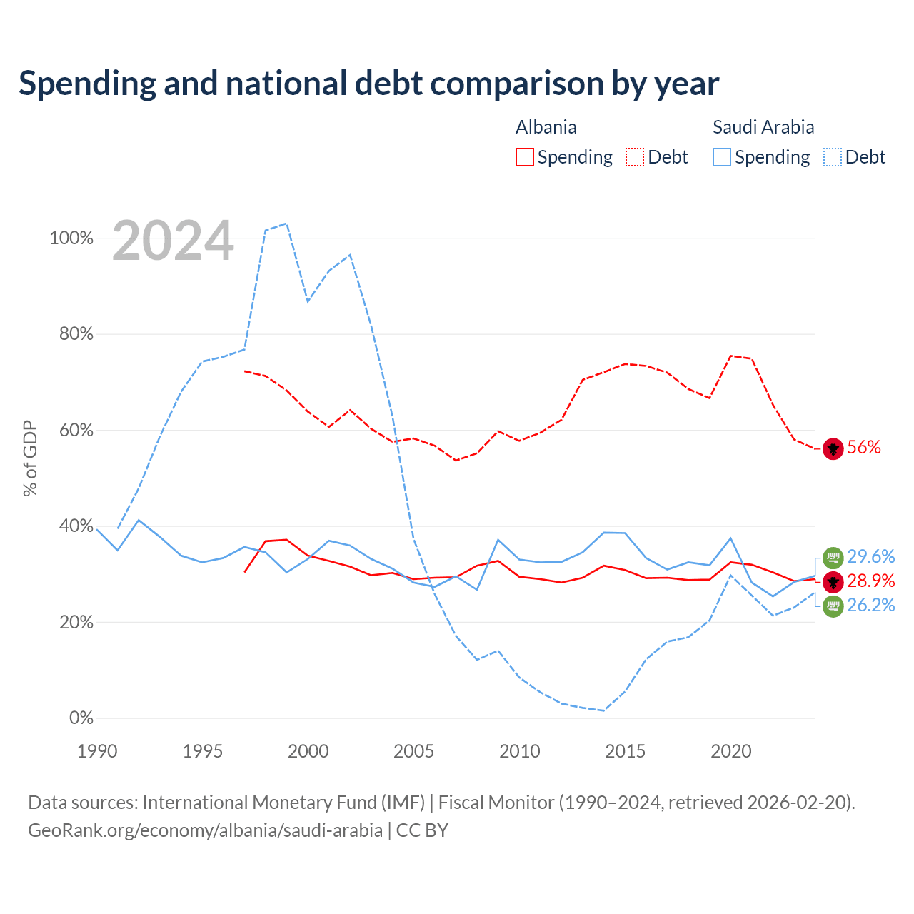 Albania has $15.2B in government debt (56% of GDP), compared to $324B (26.2% of GDP) in Saudi Arabia.
