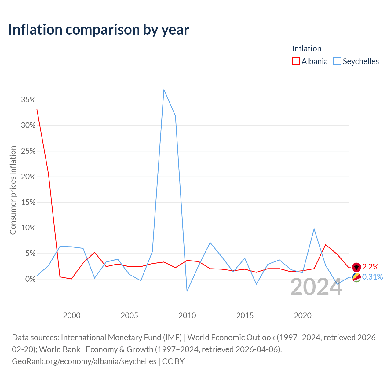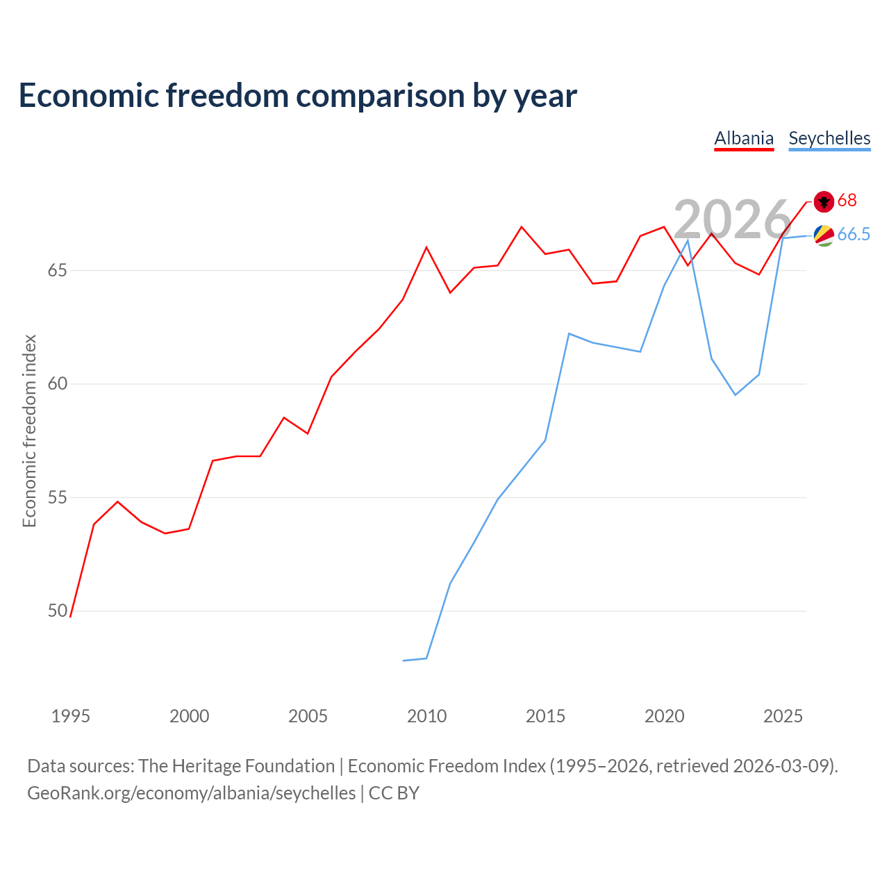 The Economic Freedom Index for Albania is 68, ranking 50/197, compared to 66.5 for the Seychelles, ranking 60/197. The chart above displays a comparison of annual changes in economic freedom indexes.
