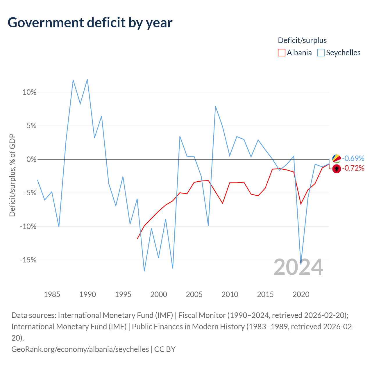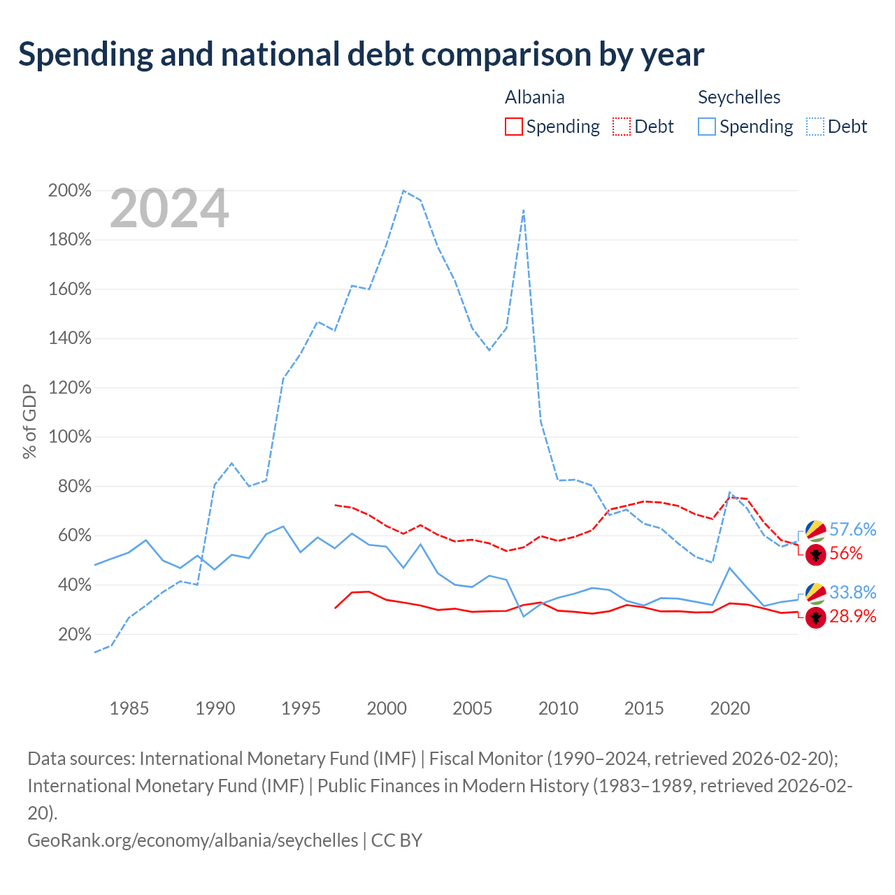 Albania has $15.2B in government debt (56% of GDP), compared to $1.25B (57.6% of GDP) in the Seychelles.