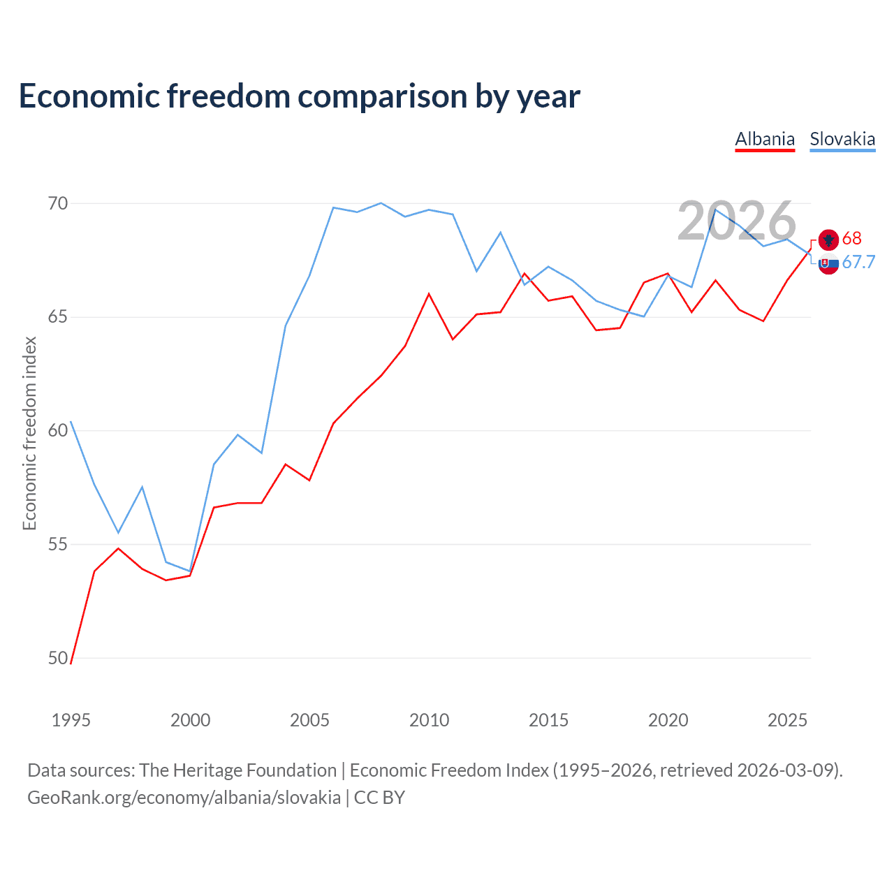 The Economic Freedom Index for Albania is 68, ranking 50/197, compared to 67.7 for Slovakia, ranking 54/197. The chart above displays a comparison of annual changes in economic freedom indexes.