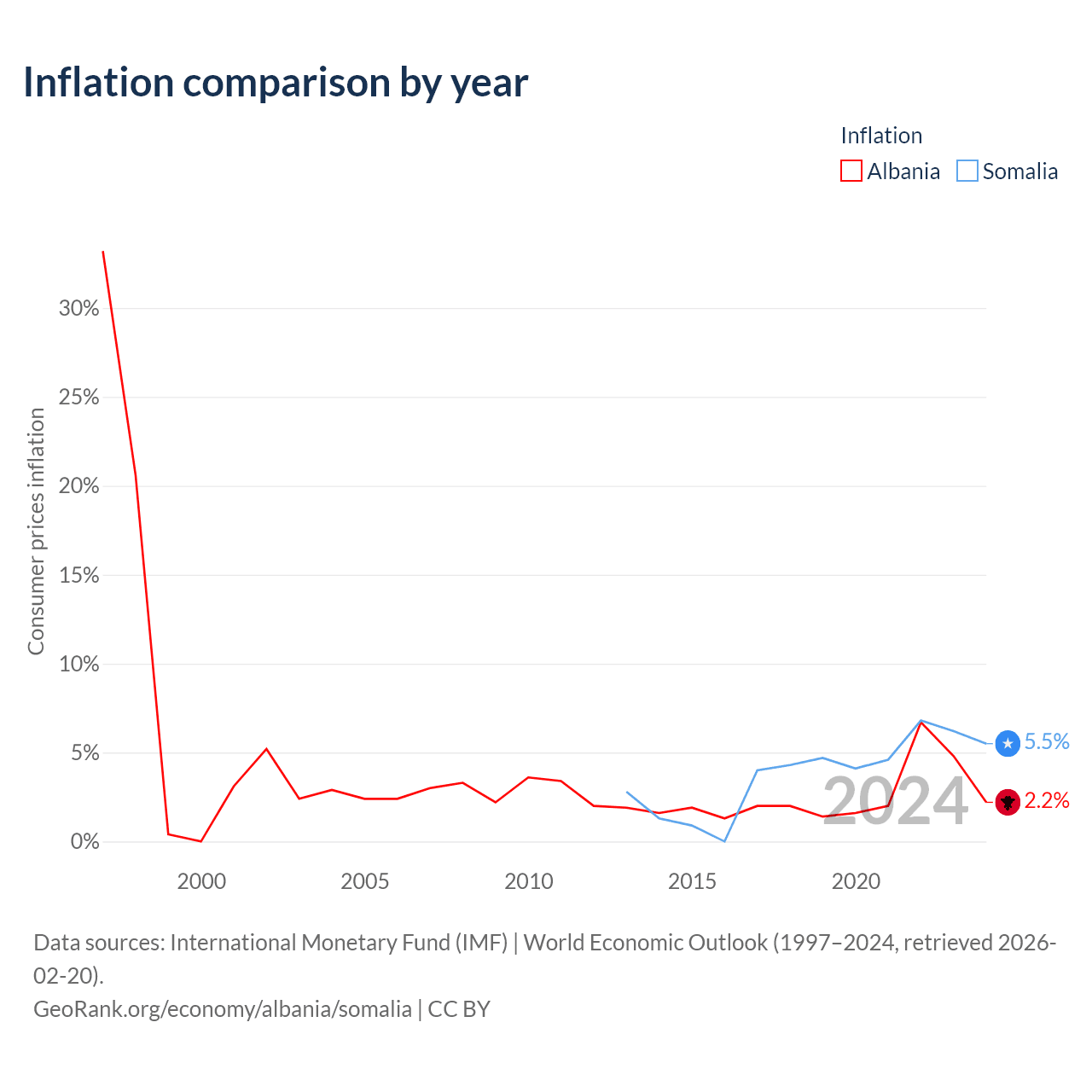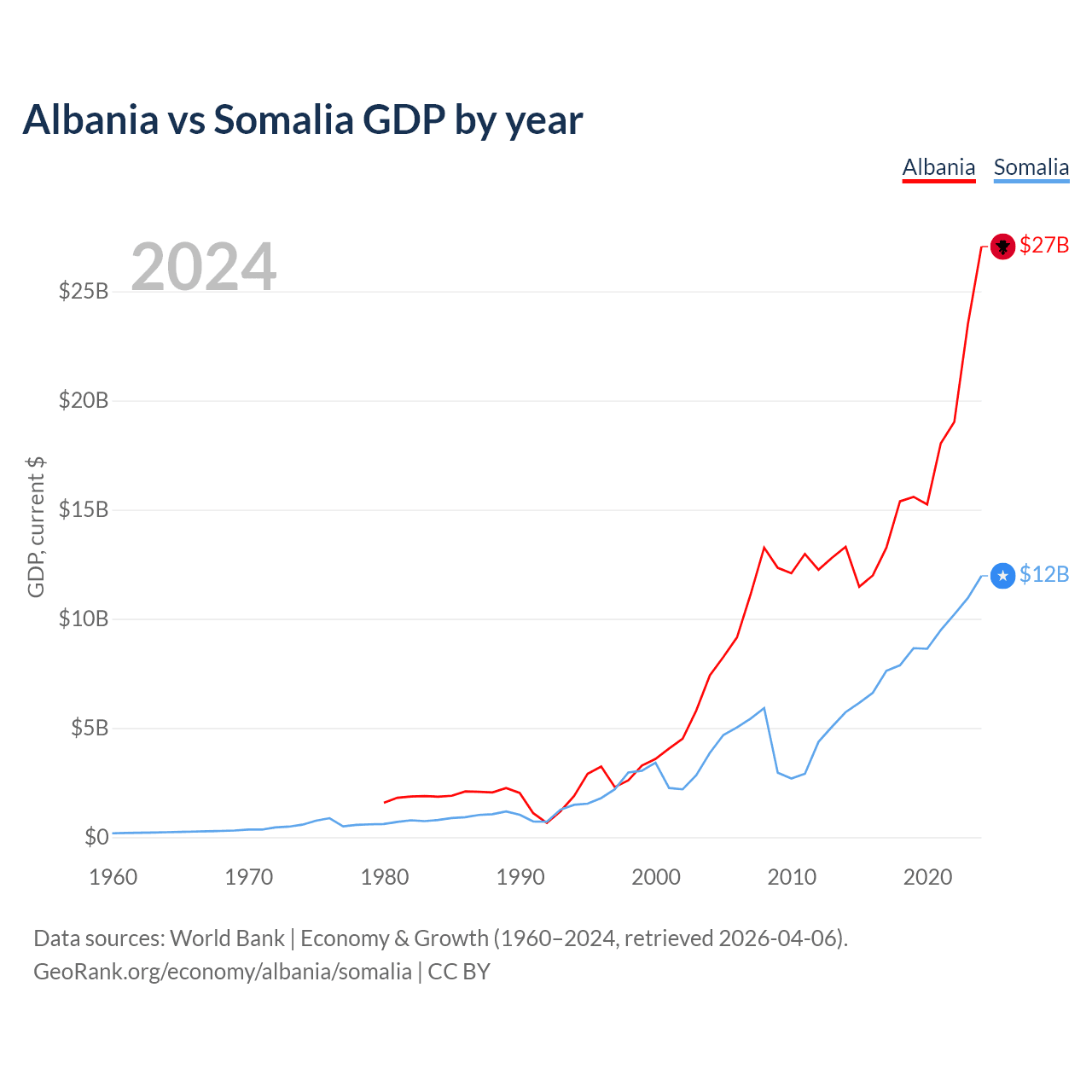 Albania has a GDP of $27B compared to $12B for Somalia, ranking 112/197 and 150/197 by economy size, respectively.