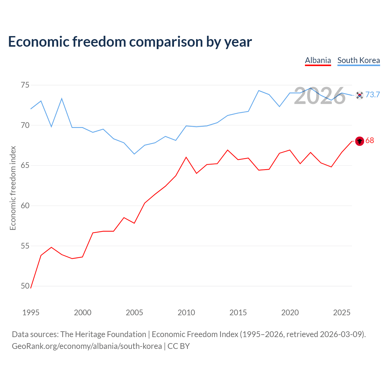 The Economic Freedom Index for Albania is 68, ranking 50/197, compared to 73.7 for South Korea, ranking 24/197. The chart above displays a comparison of annual changes in economic freedom indexes.