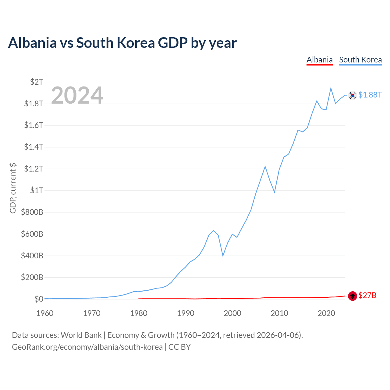 Albania has a GDP of $27B compared to $1.88T for South Korea, ranking 112/197 and 12/197 by economy size, respectively.