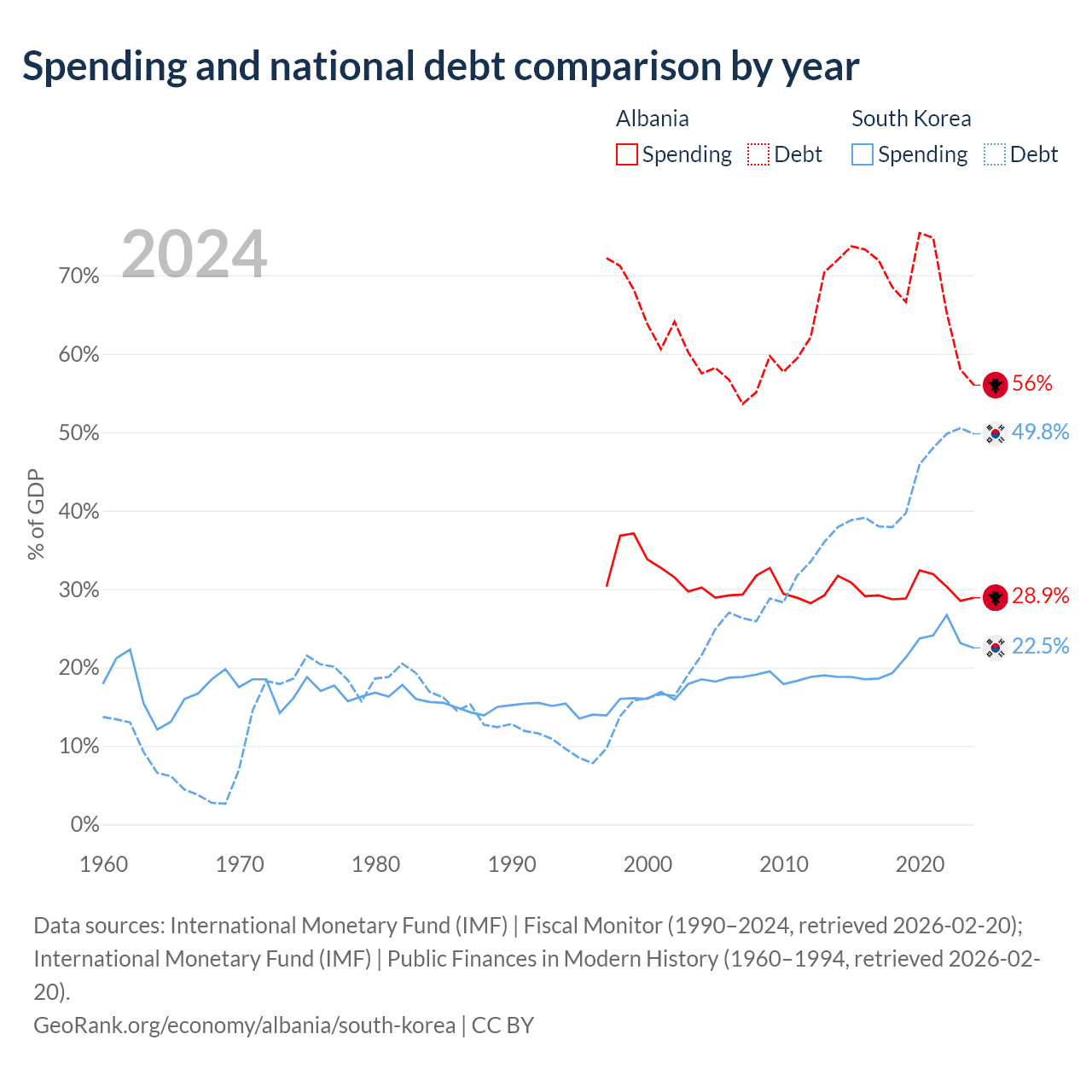 Albania has $15.2B in government debt (56% of GDP), compared to $934B (49.8% of GDP) in South Korea.