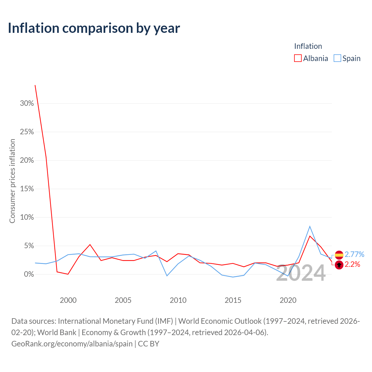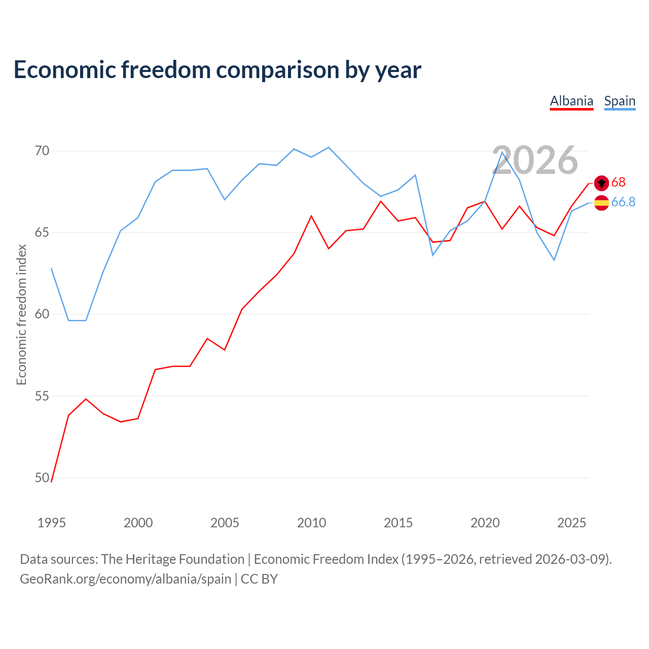 The Economic Freedom Index for Albania is 68, ranking 50/197, compared to 66.8 for Spain, ranking 59/197. The chart above displays a comparison of annual changes in economic freedom indexes.