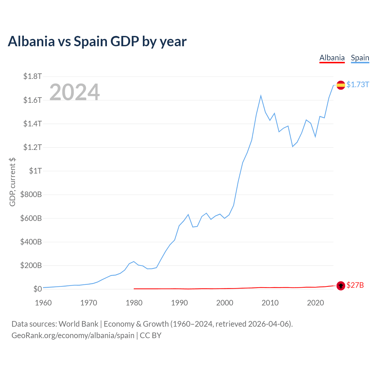 Albania has a GDP of $27B compared to $1.73T for Spain, ranking 112/197 and 15/197 by economy size, respectively.