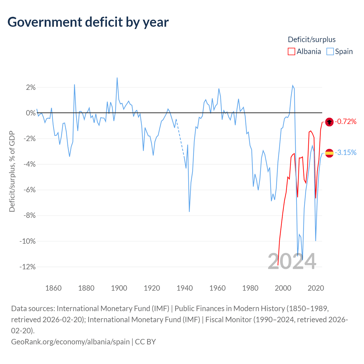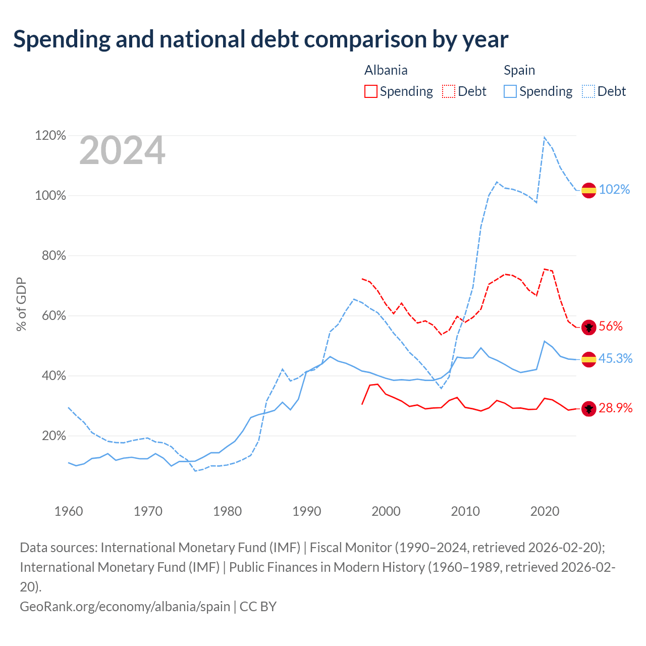 Albania has $15.2B in government debt (56% of GDP), compared to $1.75T (101.6% of GDP) in Spain.