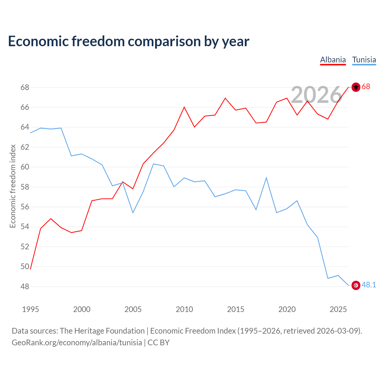 The Economic Freedom Index for Albania is 68, ranking 50/197, compared to 48.1 for Tunisia, ranking 172/197. The chart above displays a comparison of annual changes in economic freedom indexes.