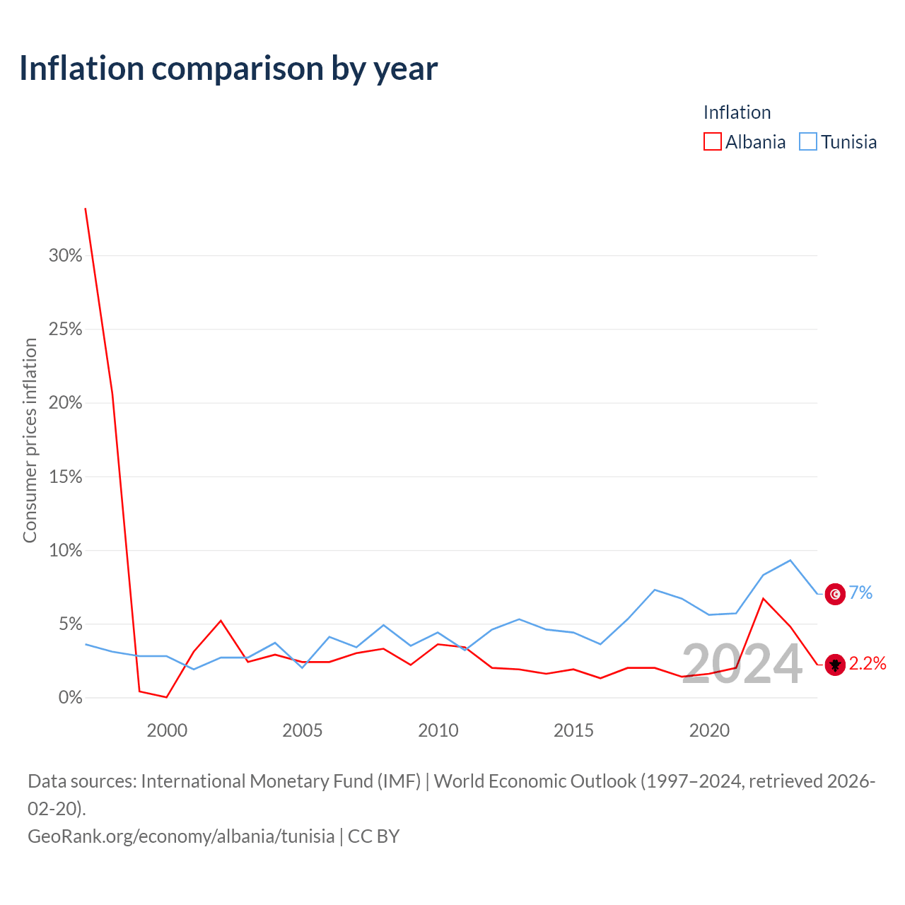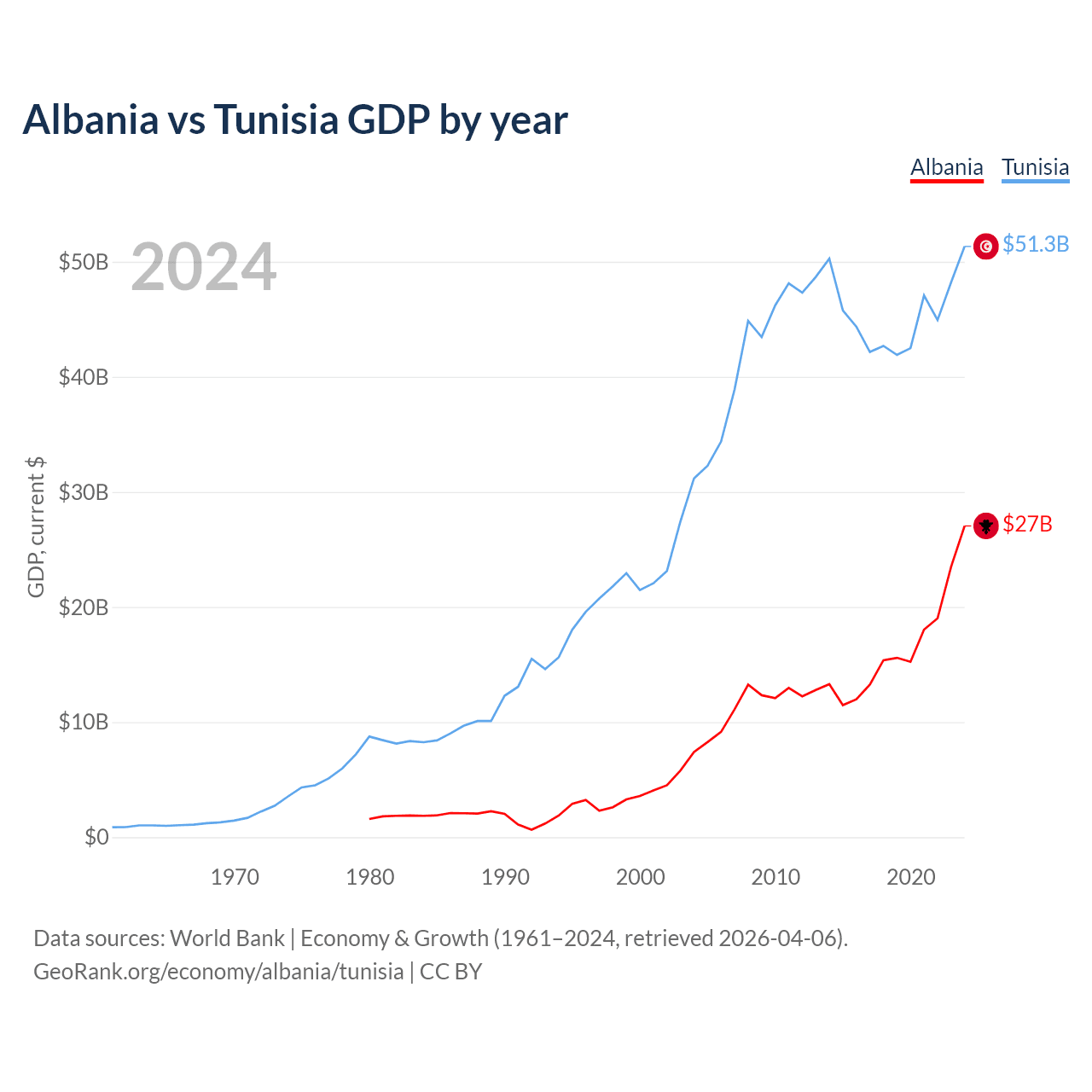Albania has a GDP of $27B compared to $51.3B for Tunisia, ranking 112/197 and 93/197 by economy size, respectively.