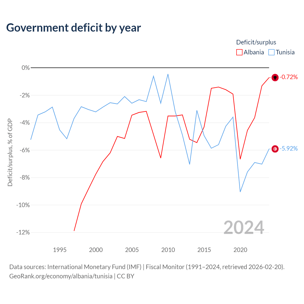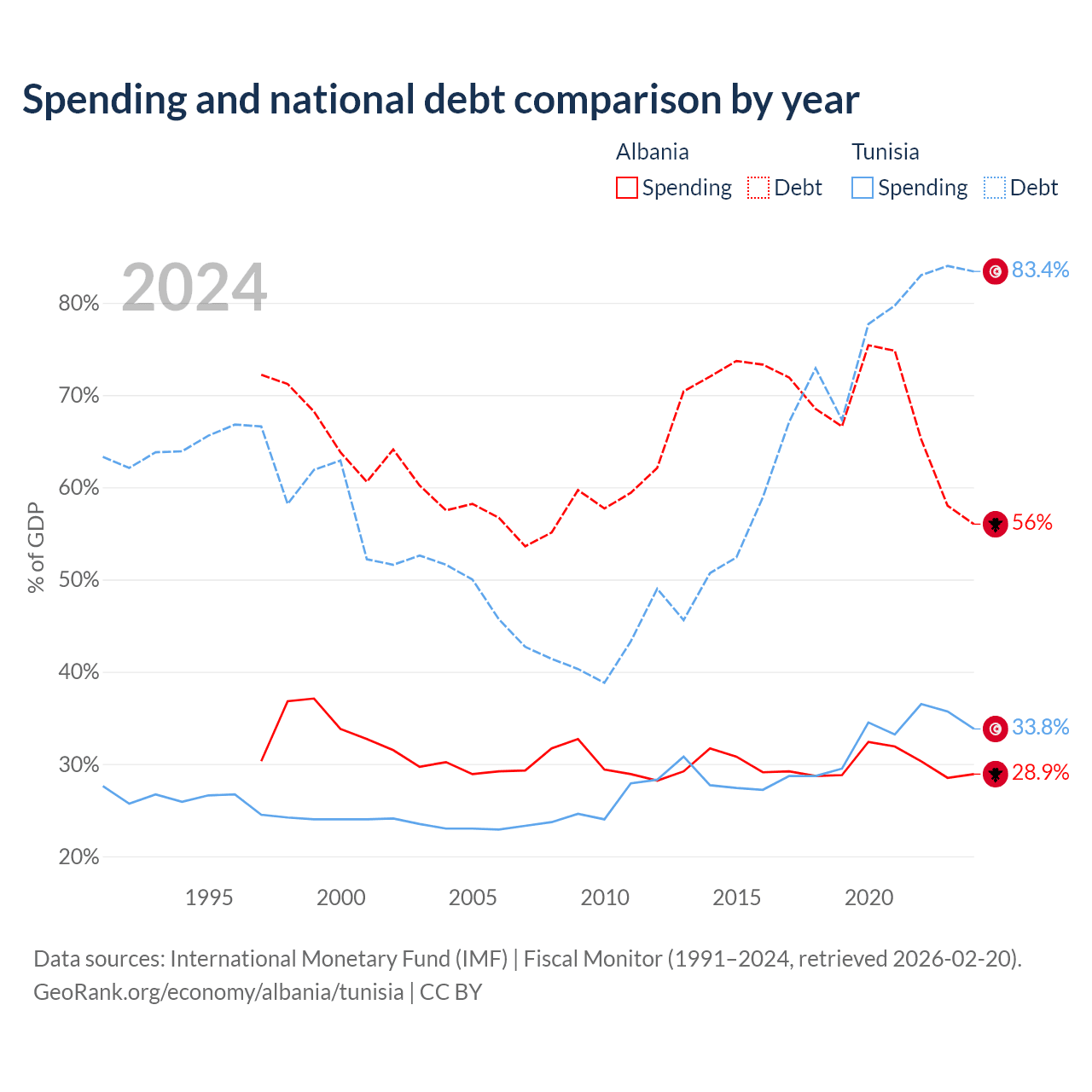 Albania has $15.2B in government debt (56% of GDP), compared to $42.8B (83.4% of GDP) in Tunisia.