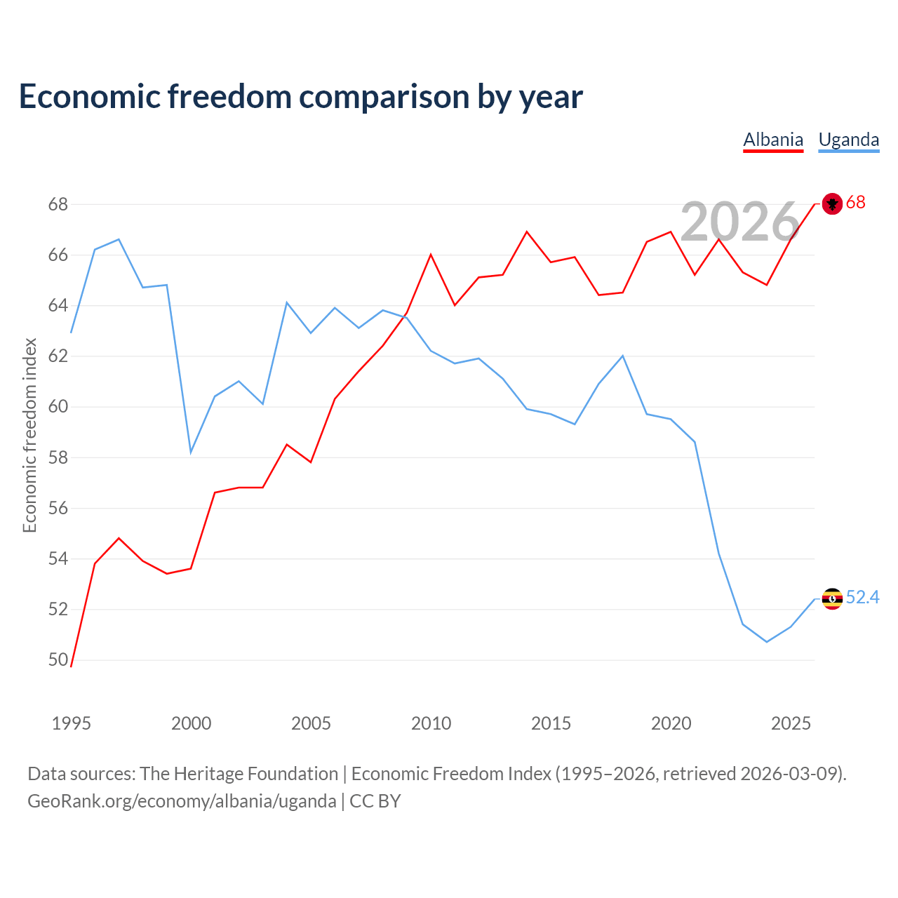 The Economic Freedom Index for Albania is 68, ranking 50/197, compared to 52.4 for Uganda, ranking 149/197. The chart above displays a comparison of annual changes in economic freedom indexes.