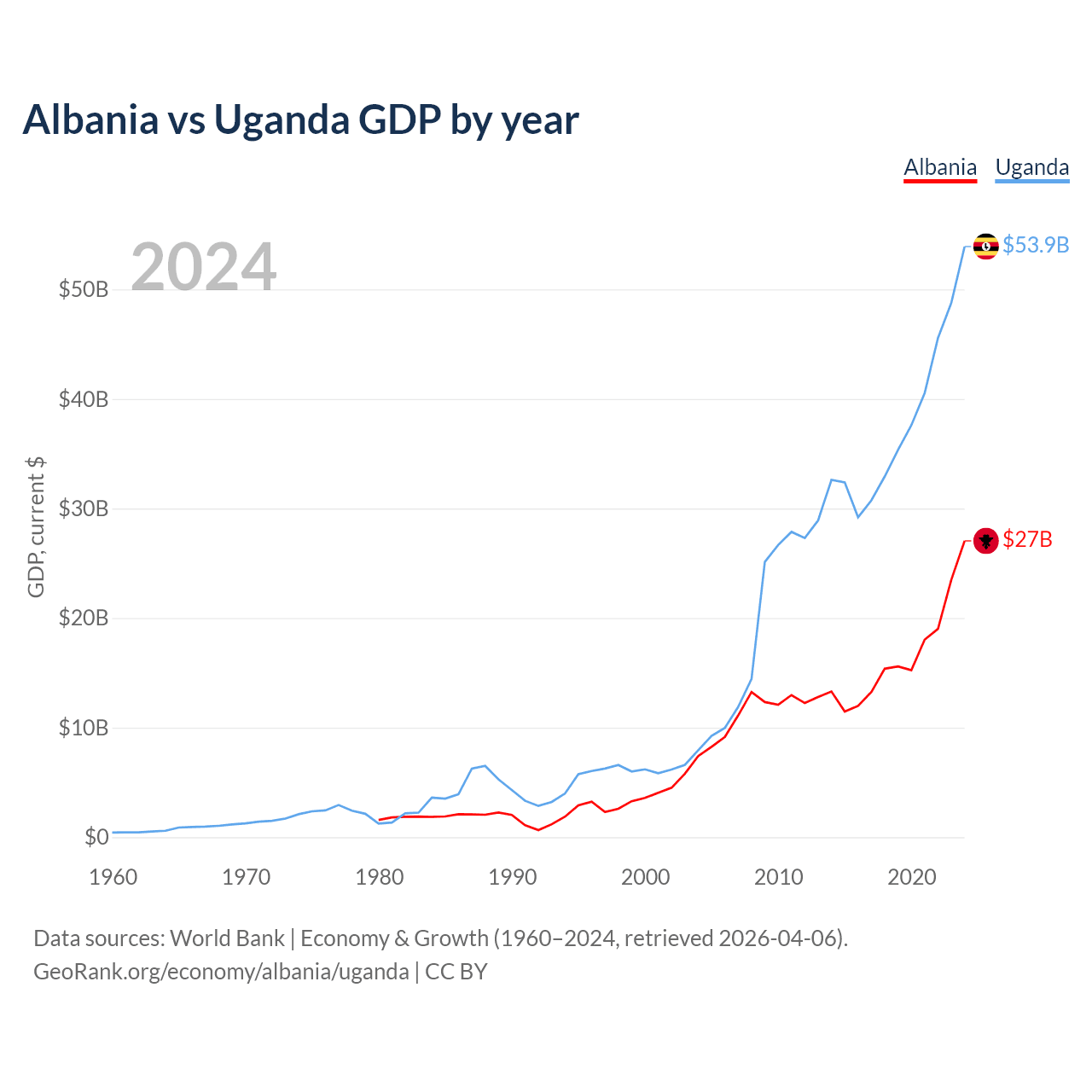 Albania vs Uganda GDP by year
