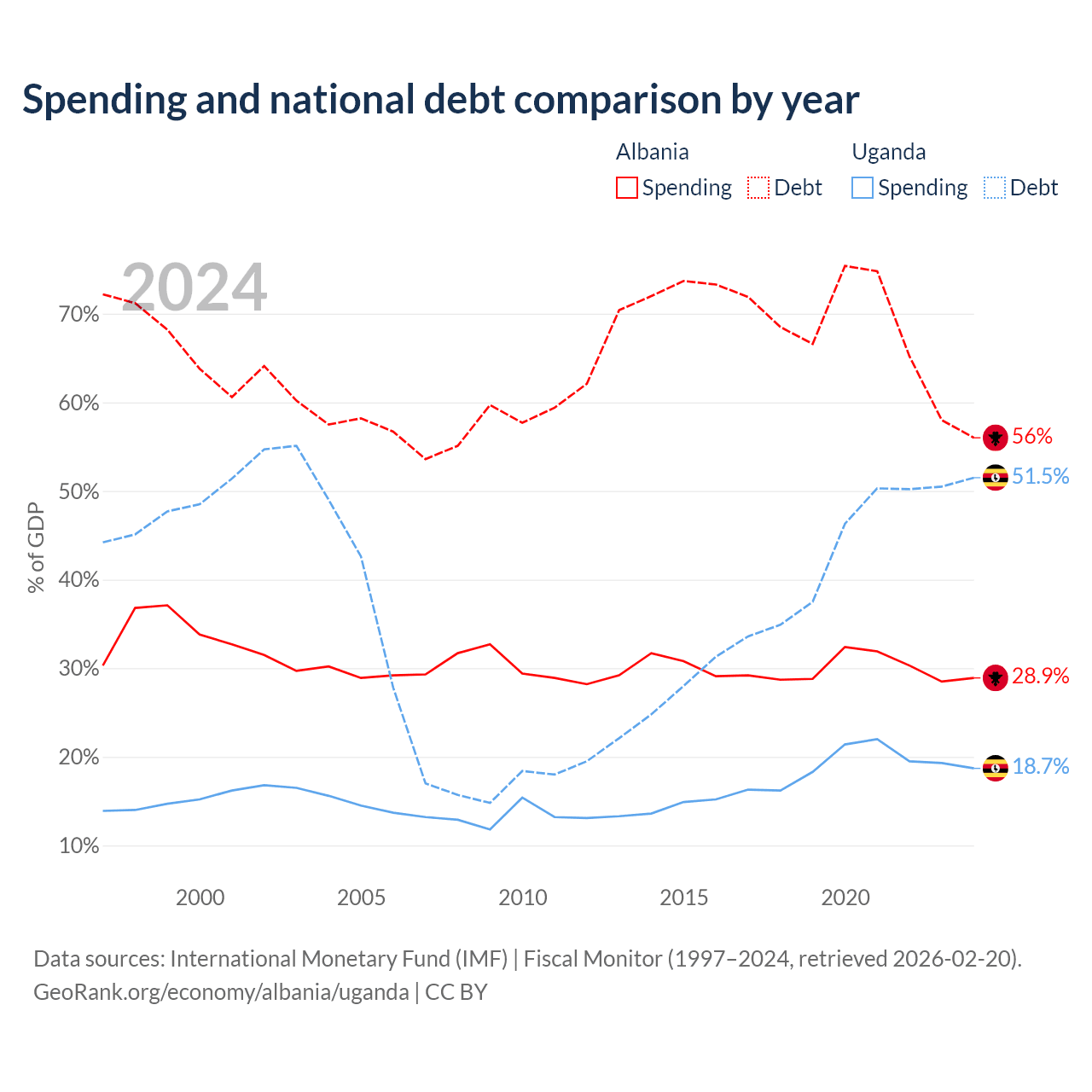 Albania has $15.2B in government debt (56% of GDP), compared to $27.8B (51.5% of GDP) in Uganda.